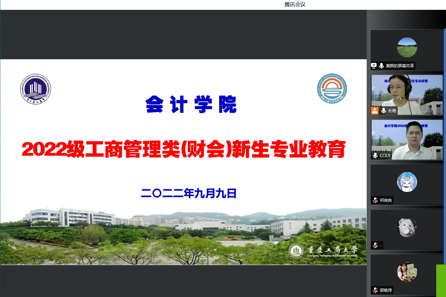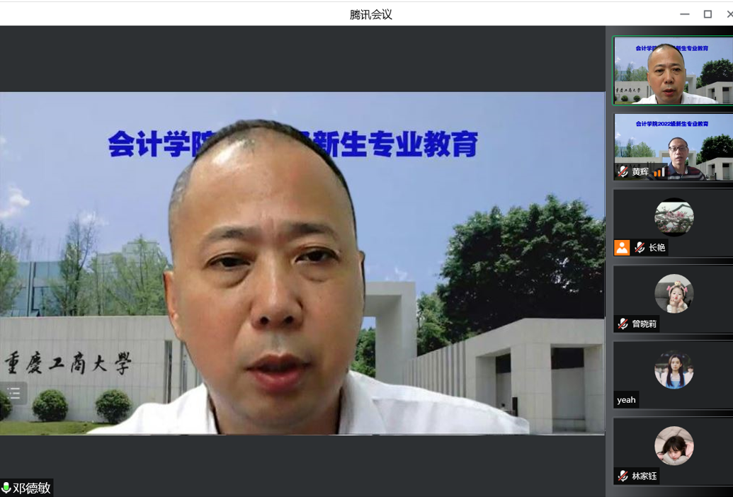2022年9月9日上午,2022级工商管理类(财会)新生专业教育以腾讯会议形式顺利举行。委书记邓德敏、经理罗勇、副经理黄辉、会计系主任蒋弘、财务系主任蒋水全、审计系主任王杏芬、财务系副主任任成林、智能会计教研室主任王世杰、综合办副主任李长艳出席专业教育会议,近400名工商管理类(财会)全体新生参加了本次专业教育。本次专业教育分为两场进行,由综合办李主任主持。