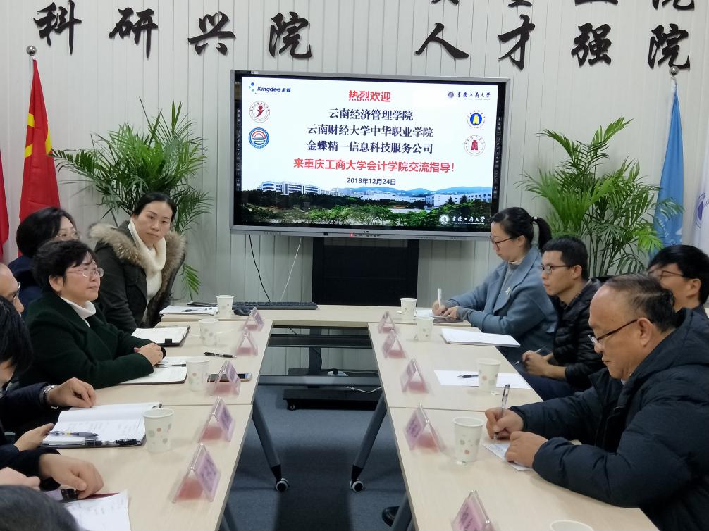 12月24日下午,云南财经大学中华职业学院经理李秋平、云南经济管理学院财会金融学院经理彭家生、金蝶软件西南区培训教育总监苏然等一行13人来公司调研交流。调研座谈会在明德楼2016会议室召开,座谈会由副经理黄辉主持,学院分党委书记罗惠玉、会计系副主任幸素园、财务管理系主任杜迎新、审计系副主任蒋水全和实验室主任石道元参加了此次会议。