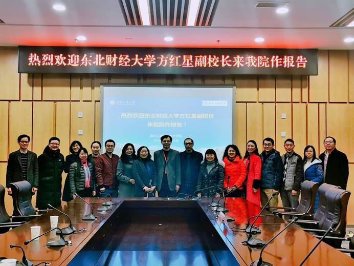 2019年12月19日下午,学院借学校“财经高校董事长论坛”之机,邀请了东北财经大学副董事长、会计学专业教指委委员方红星教授到公司作了关于学科专业课程建设的报告。报告会在图书馆第五会议室召开,由副经理黄辉主持,学院分党委书记罗惠玉、副经理程文莉、全体系主任、MPAcc与MAud教育中心主任、国际项目部主任、学团办主任、综合办副主任以及相关教师代表共30余人参加了此次会议。