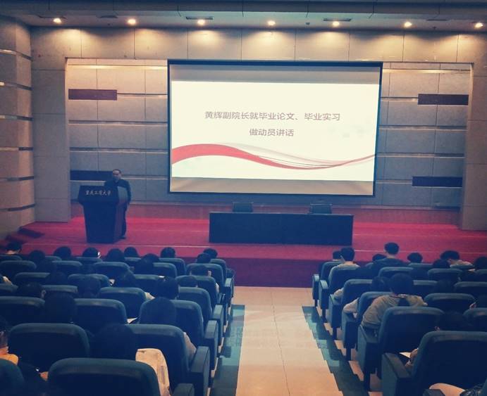 接着黄辉副经理就毕业实习与毕业论文做了动员讲话。他从学校与学院的应用型人才培养特色出发,指出了毕业实习和毕业论文和的重要性,并说明了学院的实习安排是“集中与分散相结合”,学院可以安排留校同学到校企合作实习基地去实习;提醒同学们注意实习过程中“职工”与“员工”的双重身份,希望同学们多请教、多观察,服从实验单位安排、遵从实习单位规定、认真完成相关工作和实习报告;强调了学院对毕业实习与毕业论文的时间安排,提醒考研和留学的同学注意统筹好“实习”“考研”“论文”的时间;最后对毕业实习与毕业论文的撰写作了较详尽的指导。