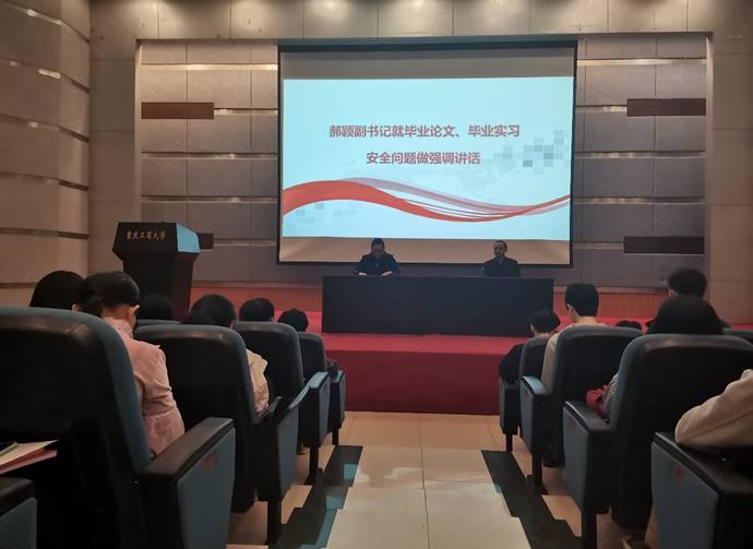 大会由李长艳老师主持。郝颖副书记首先强调了实习安全问题,提醒同学们在实习期间要注意自己的人身安全,遵守交通规则,若是滴滴拼车一定要有所警戒,注意qq防盗、钓鱼网站、电信诈骗问题,防止自己被传销组织的高薪、高待遇所诱惑,还提醒考研的同学们在校要注意防火,遵守学校公寓用电规定。