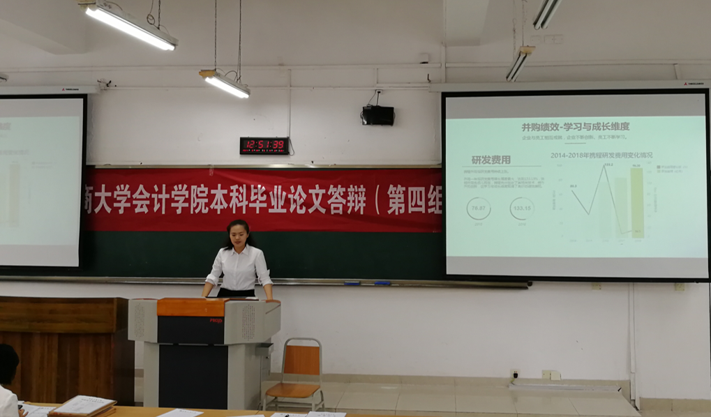 对于毕业前的最后一场“考试”,所有同学都做了充分准备。不仅穿着大方得体,制作了精美的PPT,还准备了厚厚的答辩材料,以备“挑剔”的答辩老师提问。每位员工的答辩时间控制在20分钟左右,要求员工首先结合PPT阐述了论文的选题目的、内容框架、研究方法及创新之处,随后主答辩老师对论文进行了整体评述,尤其是指出可能存在的问题,答辩组所有老师针对论文提出5-8个问题,要求答辩员工现场一一作答。整个答辩过程紧张活泼、井然有序。同学们的“论文自述”思路清晰、语言流畅、声音洪亮,针对答辩老师的提问,很多同学还能进行拓展阐述。针对需要修改的论文,答辩老师指出了其中的问题,要求员工结合答辩组的意见,在指导老师指导下继续完善,按时提交。