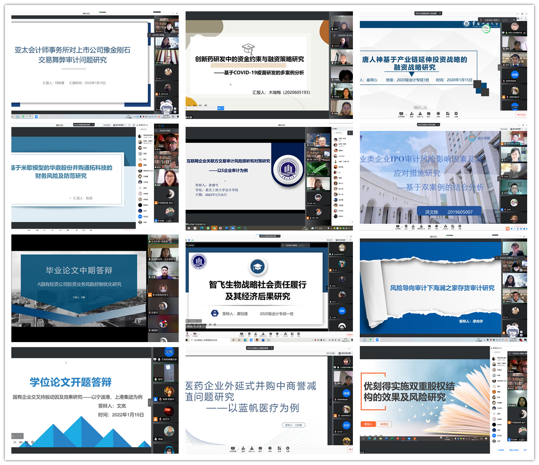 在bb贝博艾弗森官方网站统筹安排与部署下,研究生教育中心扎实做好线上答辩相关准备工作,保障疫情防控期间线上答辩有条不紊。本次答辩共分为12组,共122名研究生参与答辩,其中2019级中期答辩5组,2020级开题答辩7组。来自暨南大学、兰州大学、哈尔滨工程大学、西南财经大学、东北师范大学、吉林财经大学、湖南工商大学、广东外语外贸大学、北京物资学院等会计审计导师担任组长,与公司部分硕士研究生导师和事业导师共同组成答辩专家组,为同学们的论文进行强化指导。