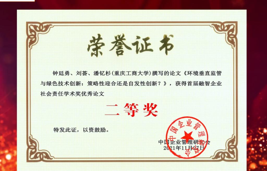 11月27日,在国家自然科学基金委员会管理科学部指导下,由中国企业管理研究会社会责任与可持续发展专业委员会、暨南大学管理学院、北京大学战略研究所等单位联合主办的“第三届可持续发展与企业社会责任学术研讨会”圆满结束。bb贝博艾弗森官方网站2020级会计学硕刘荟和2020级会计专硕潘亿衫合作撰写的论文《环境垂直监管与绿色技术创新:策略性迎合还是自发性创新?》喜获首届“融智”企业社会责任学术奖优秀论文二等奖!