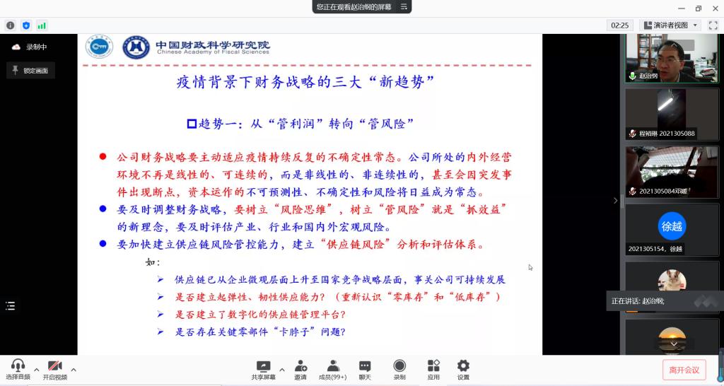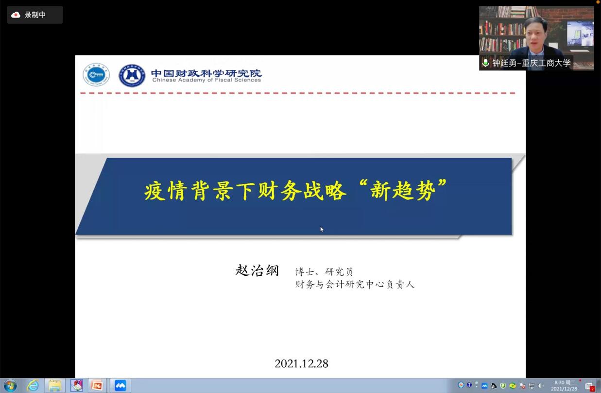 12月28日,bb贝博艾弗森官方网站第31期会计/审计名家大讲堂以在线会议的形式顺利举行。中国财政科学研究院(原财政部科研所)财务与会计研究中心负责人赵治纲教授应邀为bb贝博艾弗森官方网站研究生作了《疫情背景下财务战略“新趋势”》的专题讲座,bb贝博艾弗森官方网站部分教师代表也参加了此次讲座。讲座由bb贝博艾弗森官方网站副经理钟廷勇教授主持。