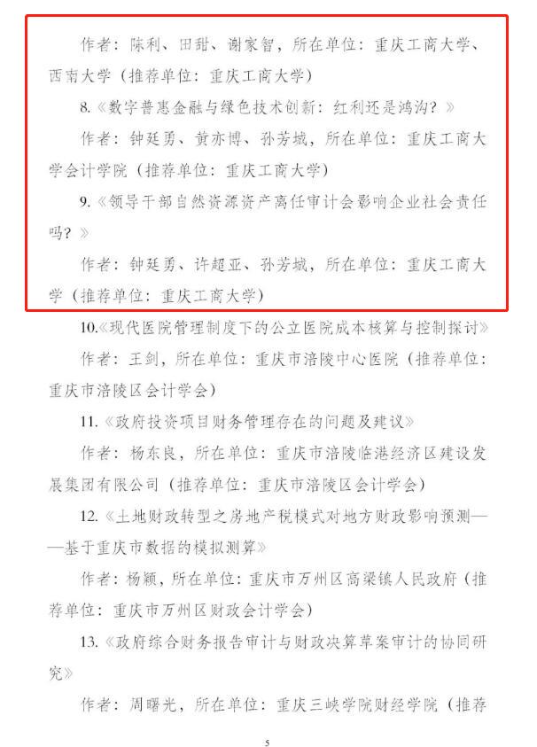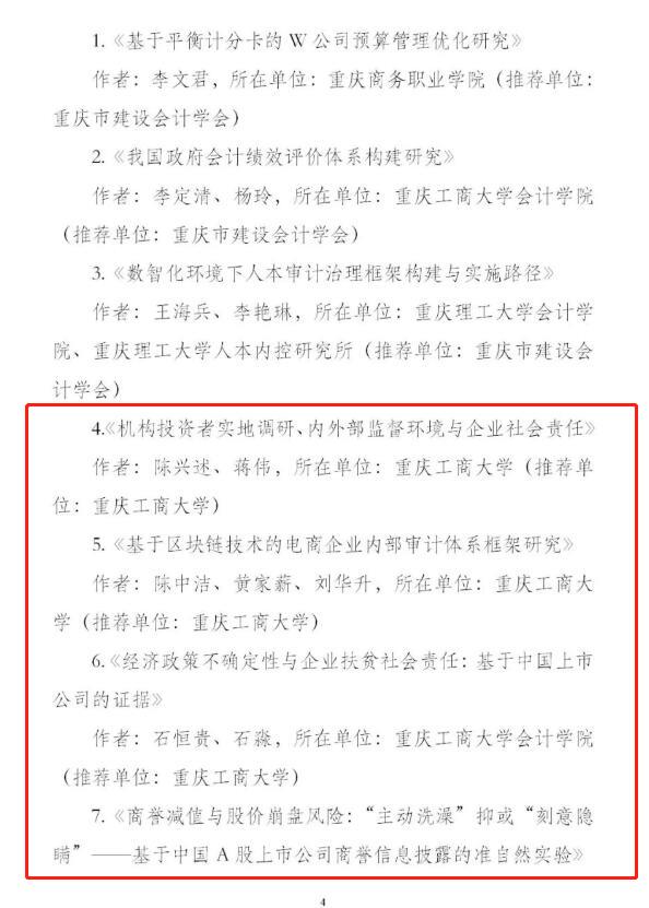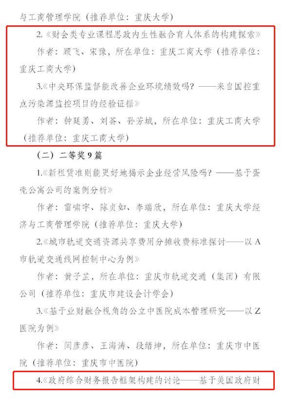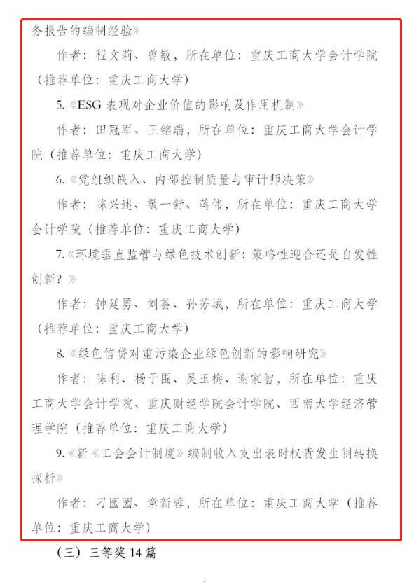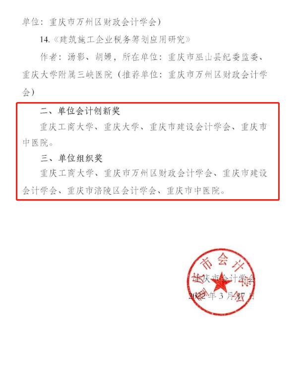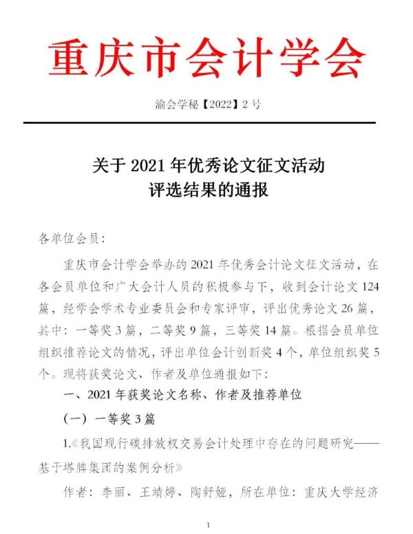 近日,重庆市会计学会发布通报(渝会学秘〔2022〕2号),公布了学会2021年优秀论文征文活动评选结果。公司申报的33篇论文中,共14篇获得优秀论文奖,其中一等奖2篇、二等奖6篇、三等奖6篇,同时公司获得“单位会计创新奖”、“单位组织奖”两项组织奖项,获奖论文篇幅数目和等次较往年有较大提升,充分彰显了公司教师的会计理论研究水平。