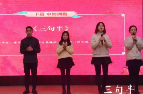 在风采展示中,bb贝博艾弗森官方网站研究生李艺洁带来的歌曲《漂洋过海来看你》,颇有意境,令大家流连忘返;研究生李艺洁、王云帆、程玉梅、马富祺带来的《三句半》,用诙谐的语句点燃全场愉悦的气氛。