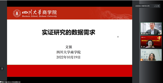 10月19日上午,bb贝博艾弗森官方网站第四期会计/审计学术大讲堂在线上会议顺利举行。厦门大学应用经济学博士后,现任四川大学商学院副研究员文强受邀为bb贝博艾弗森官方网站师生做了题为《实证研究的数据需求--基于CCER经济金融数据库》的专题讲座,学院的部分研究生、学业导师、专任教师参与了本次讲座。讲座由bb贝博艾弗森官方网站专硕教务秘书赵亚老师主持。