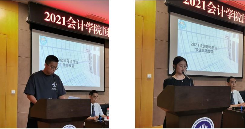 随后,2021级CIMA班新生代表赵睿煊同学、ACCA班新生代表史莫凡同学分别发言。赵睿煊同学表达了自己初为工商学子的激动心情,也分享了他的未来规划,希望大家既有国际视野又有家国情怀。史莫凡同学表达了对学院的感谢,表示大学四年要有清晰的职业规划,希望21级bb贝博艾弗森官方网站国际项目班同学活出自我、拼出精彩。