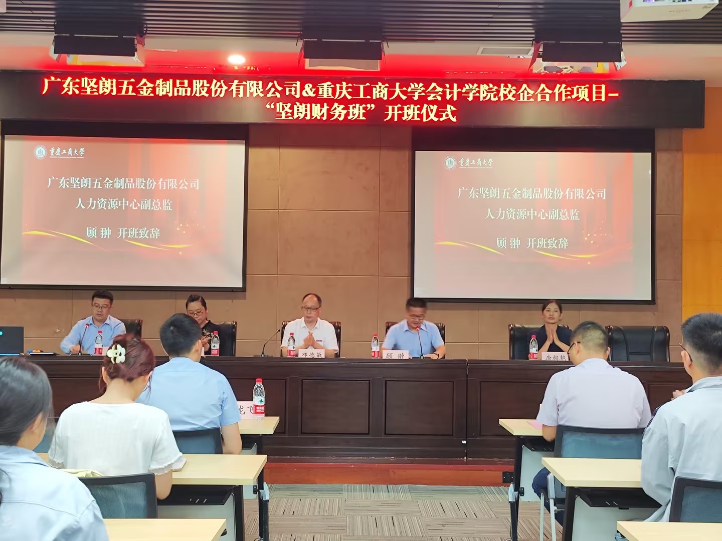 邓德敏致欢迎辞,他对广东坚朗五金制品股份有限公司给予的充分信任和支持表示诚挚的感谢,对“坚朗财务班”开班表示热烈的祝贺。他详细介绍了学院的办学历史、团队建设情况、团队力量、员工概况等,他表示,今年5月24日学院领导带队赴坚朗公司开展“访企拓岗”活动并签署了双方合作协议,“坚朗财务班” 是落实“访企拓岗”成果和合作协议内容的重要举措。订单班的设立得到了学院各级领导的大力支持和帮助,希望能与坚朗公司一起培养出高素质的应用型财会专业人才,也希望同学们珍惜学习时光,勤于思考、善于总结、积极探索。