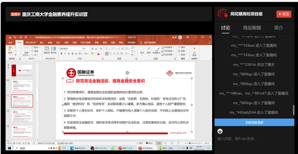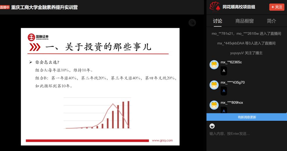 整个活动采用线上直播方式进行,主办方邀请了国融证券资深金融讲师主讲金融知识,其具有丰富的金融行业经验和教学经验。通过行业前沿理论教学+模拟仿真实训,讲师们深入浅出地讲解了各种金融知识,并通过生动的案例和实际操作演示,使同学们更好地理解和掌握相关知识。