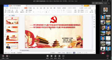 会议开始,教工二支部书记蒋水全同志首先对《决议》主要精神内容进行了梳理,他介绍了《决议》起草的背景、《决议》把握的三个要点、《决议》中总结出的4个历史阶段、13方面历史性成就、5大历史意义、10大历史经验、1个号召,建议各位教师党员要把学习党的十九届六中全会精神与深化党史学习教育相结合、与财务系高质量发展相结合,主动担当、勇于作为,力争为学院教学科研服务做出更大贡献。