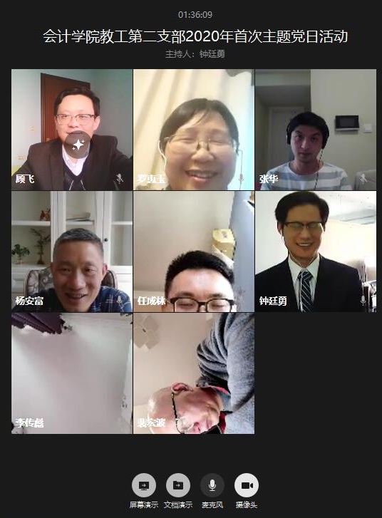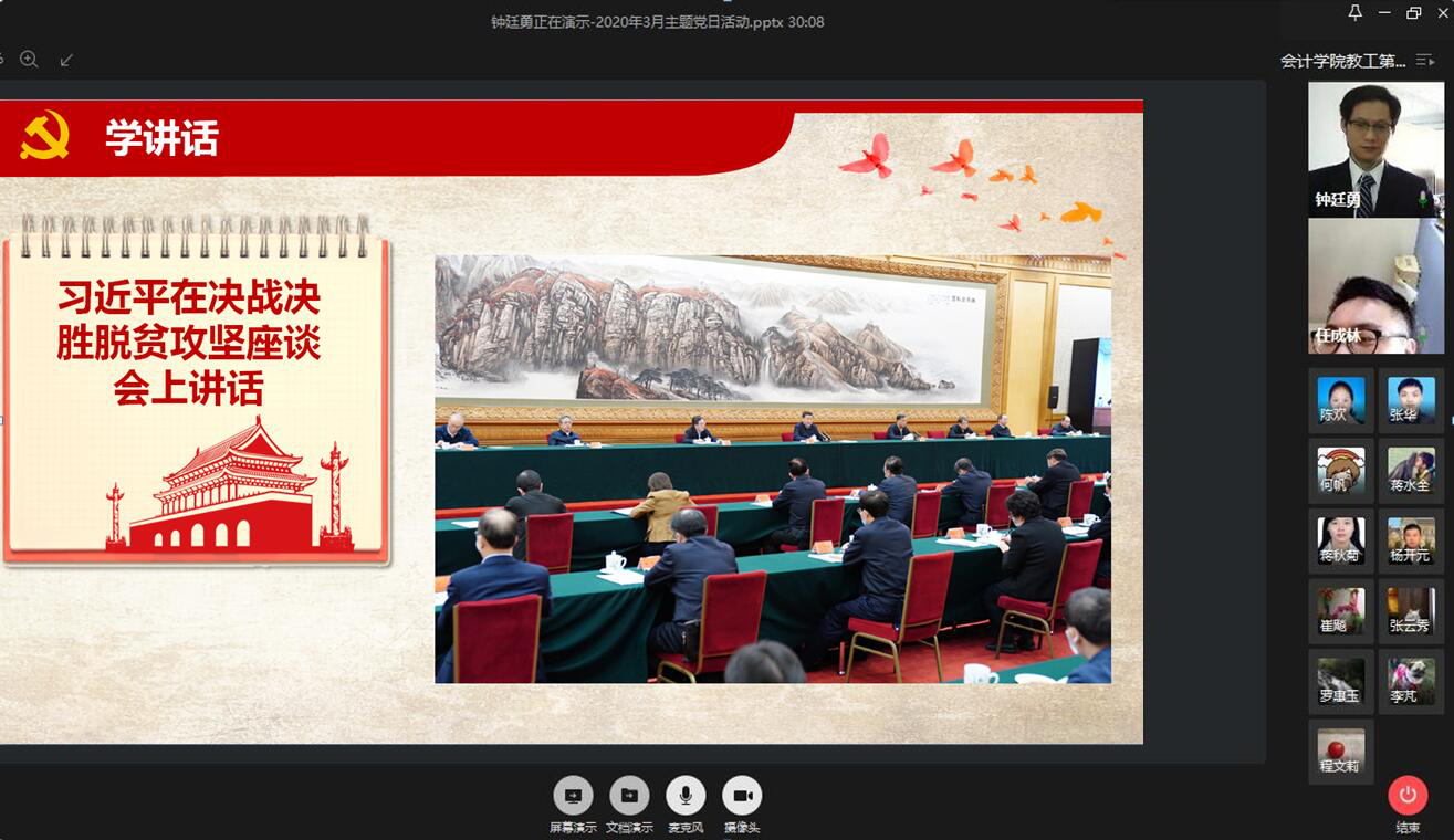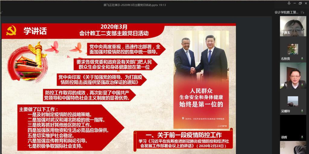bb贝博艾弗森官方网站教工二支部支委顾飞同志、支部书记钟廷勇同志先后领学和解读了《习近平在统筹推进新冠肺炎疫情防控和经济社会发展工作部署会议上的讲话》《习近平在决战决胜脱贫攻坚座谈会上的讲话》两个重要文献,特别提出各位党员教师同志应重点关注习近平总书记在讲话中专门强调的“企业复工复产面临的债务偿还、资金周转和扩大融资等迫切问题”“防止企业资金链断裂”等党和国家重点关切的企业财务管理专业领域相关问题,将其有效地融入专业课堂和科学研究之中,激发员工为促进企业复工复产、推动我国经济社会高质量发展贡献专业智慧的勤学报国之心,为广老员工居家网络学习注入价值新动力和思想新动能。