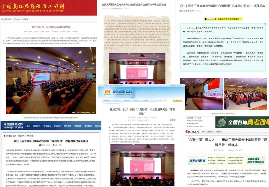 据悉,bb贝博艾弗森官方网站历来就高度重视课程思政建设,在坚持近20年不间断开展“不做假账从考试不作弊开始”的诚信“免监考”课程思政的基础上,近年来又基于“以一流课程思政引领一流专业和一流课程建设”的卓越课程思政理念,探索形成了“德、知、能一体 教、学、做合一”的财会类专业课程思政协同育人新模式,形成了“课程-专业-学科”闭环衔接、本硕联动的“大课程思政”育人格局。学院基于“财务管理案例”本科课程实践所凝练而成“一体两翼三结合六协同”课程思政融合应用创新案例,被学校推荐参评“2019年度重庆市高校在线课程建设与应用示范案例”;基于“商业伦理与会计职业道德”硕士研究生课程实践探索所凝练而成的“六育协同”课程思政模式被“中国教育在线”“全国高校思想政治工作网”以及“中国会计学会”“重庆市财政局”官微官网等主流媒体关注报道。