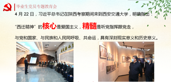 2020年5月28日,bb贝博艾弗森官方网站员工第二党支部对毕业生党员进行离校前党性教育,支部全体党员参加。本次党课共有三部分内容组成。首先,支部书记付海南带领大家共同学习 “西迁精神”,向全体党员介绍了“西迁精神”的历史背景、“西迁精神”的核心与精髓,观看了习近平总书记到西安交通大学调研时的相关视频。
