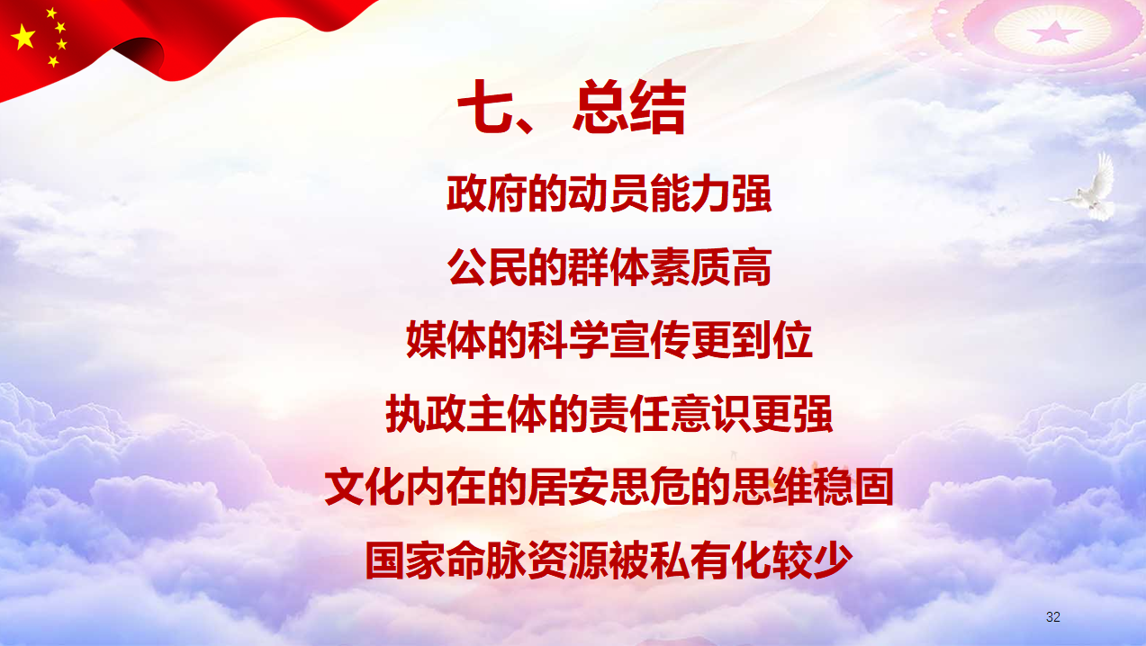 最后,蒋弘总结应对疫情“中国为什么能?”,原因在于政府的动员能力强、公民的群体素质高、媒体的科学宣传更到位、执政主体的责任意识更强、文化内在的居安思危的思维稳固、国家命脉资源被私有化较少,而这些也恰恰是美国等西方社会所缺乏的。