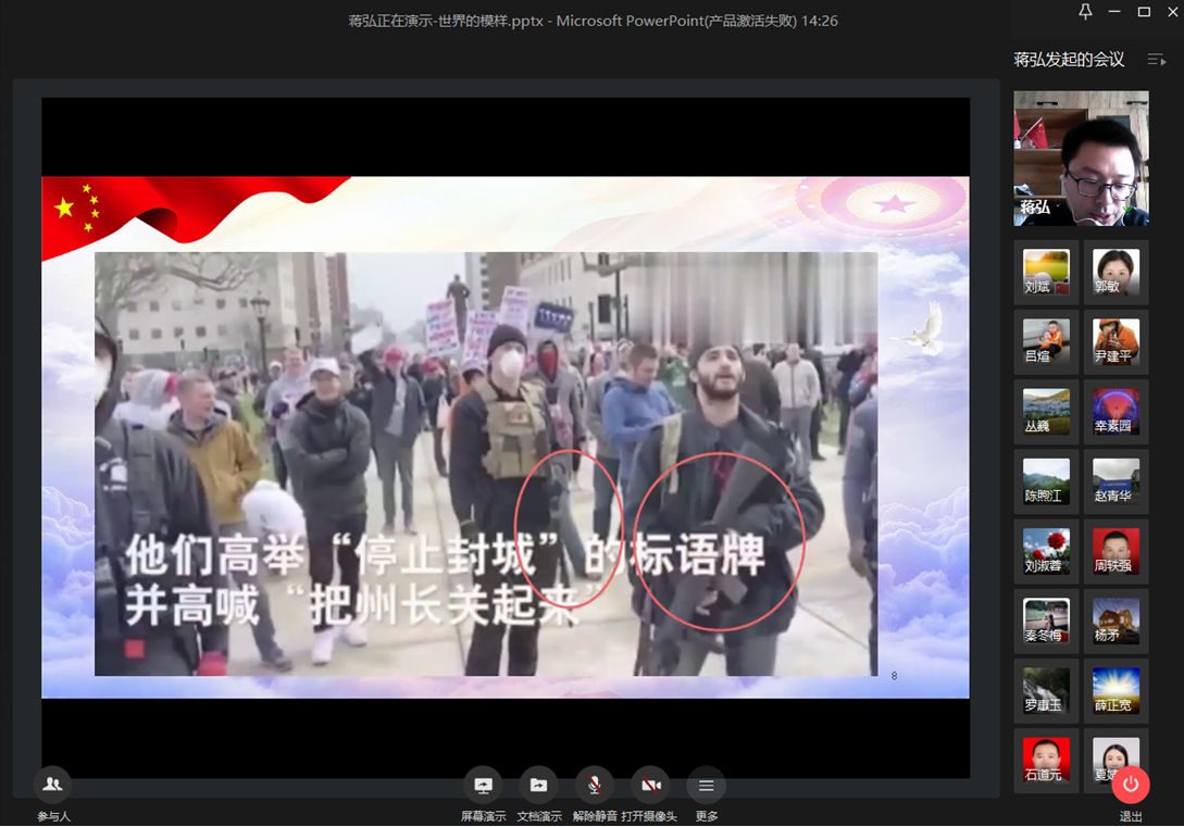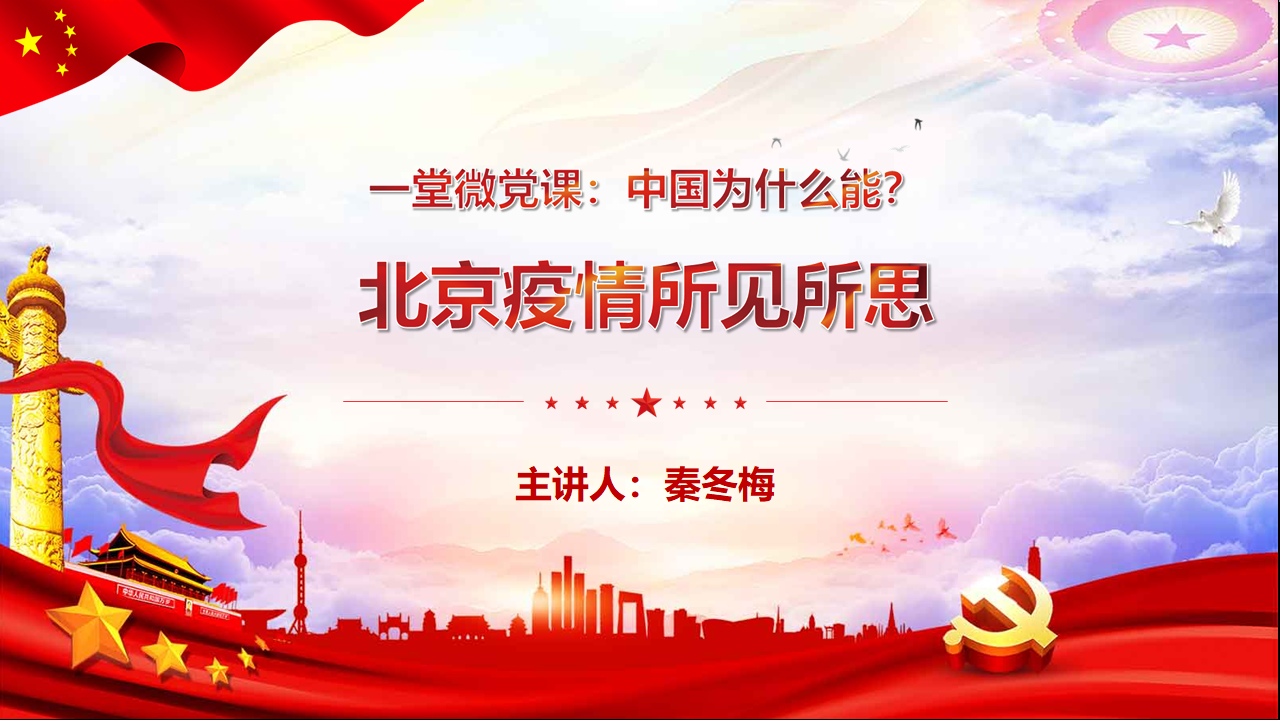 6月24日,bb贝博艾弗森官方网站教工一支部通过企业微信视频会议召开了“一堂微党课:中国为什么能?”主题党日活动,本次活动围绕习近平总书记关于疫情防控重要讲话和指示批示精神,充分运用数据和事例,以生动的话语向党员同志讲述了在抗疫过程中我国的制度优势以及中国共产党牢记人民利益高于一切的责任担当。会议由支部书记蒋弘主持,蒋弘和宣传委员秦冬梅在微党课上分别分享了他们所搜集和整理的相关内容,与党员同志共勉。