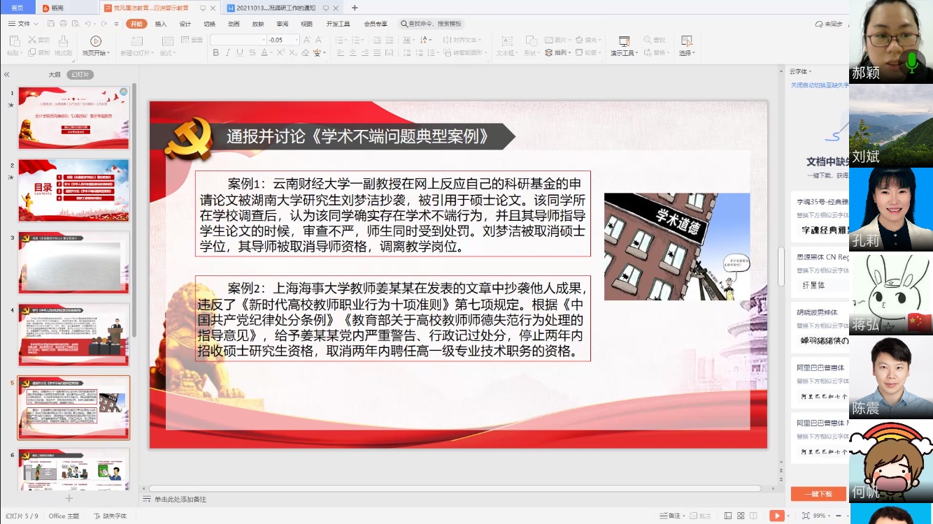 今天的会议让大家都深受启发,线上讨论热烈。纪委委员蒋弘认为,员工和老师最难克服的事情往往不是在业务能力上难以提升而是面对压力和诱惑时不去踩踏道德和法律的红线。员工为什么抄袭,想早点毕业、想早点工作、想早点挣钱;老师为什么抄袭,想考核过关、想职称评定、想奖项申报。我们经常看到和听到,一些人毕业了、工作了、甚至退休了,他的一些不堪的陈年往事和个人秘密被人民群众从历史中翻查出来,最后弄得晚节不保,结果就是“眼看他盖高楼,眼看他宴宾客,眼看他楼塌了”。所以,员工和老师坚持思想上的底线,就是在给自己一个完整、正常、稳定的人生。财务管理系主任蒋水全表示,高公司党政廉风建设最重要的内容之一是防治学术不正之风。作为高校教育工作者,一是要以身作则,杜绝学术不端行为;二是作为本科学业导师、研究生导师要引导员工学术价值观,不为了做学术而做学术,同时要多次检查员工学术成果和论文数据,防止学术不端;三是学校应该建立学术不端检查复查机制,全方位打击学术不正之风。