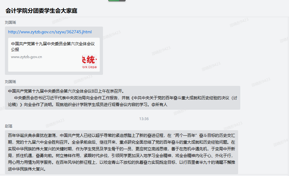 19级财务管理学一班赵瑾同学:百年华诞庆典余音犹在激荡,中国共产党人已经以超乎寻常的紧迫感踏上了新的奋进征程,在“两个一百年”奋斗目标的历史交汇期,党的十九届六中全会胜利召开。全会承前启后、继往开来,重点研究全面总结了党的百年奋斗的重大成就和历史经验问题。在实现中华民族的伟大复兴的关键时期,作为员工党员及员工骨干的一员,更应树立底线思维,善于在危机中遇先机,于变局中开新局,抓住机遇,奋勇向前。树立榜样作用,紧跟时代步伐,引领同学更加深入地学习全会精神,将全会精神内化于心、外化于行,用心用力用情为同学服务。在百年风华的新征程上,以咬定青山不放松的执着奋力实现既定目标,以行百里者半九十的清醒不懈推进中华民族伟大复兴。