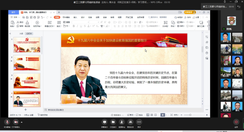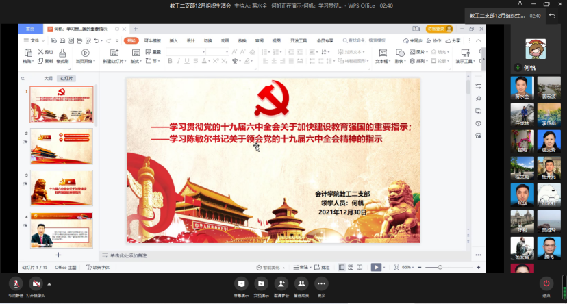 为深入学习贯彻党的十九届六中全会精神,2021年12月30日晚上7时,bb贝博艾弗森官方网站教工二支部组织开展了十九届六中全会精神专题学习活动,学习了《中共中央关于党的百年奋斗重大成就和历史经验的决议》,会议由支部书记蒋水全主持。