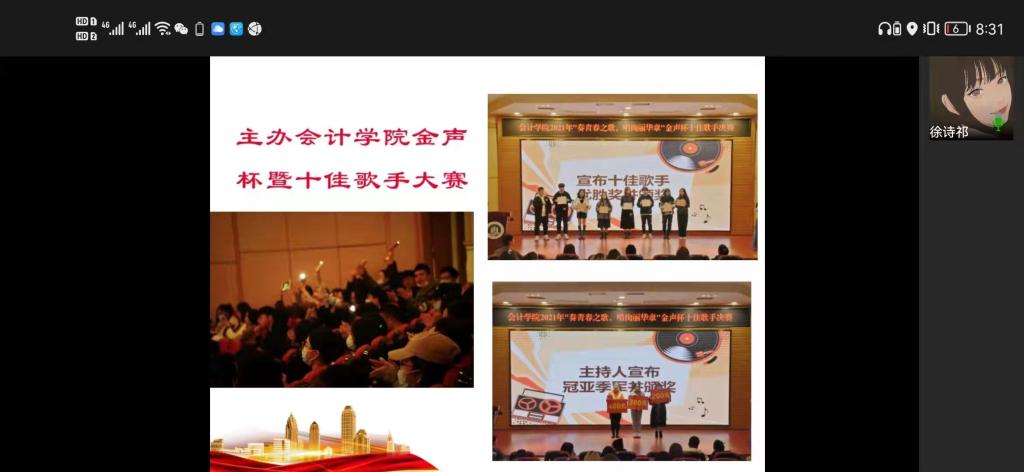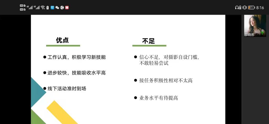 接着,分团委社会实践部黄晓楠从国庆线上打卡活动、员工组织骨干素质大会、提案大赛、其他活动、部门总结等五个方面进行工作汇报。她表示,社会实践部本学期表现良好,完成本部门的任务的同时也尽可能协助其他部门开展工作。希望在下一学期社会实践部能够更上一层楼,继续进步。