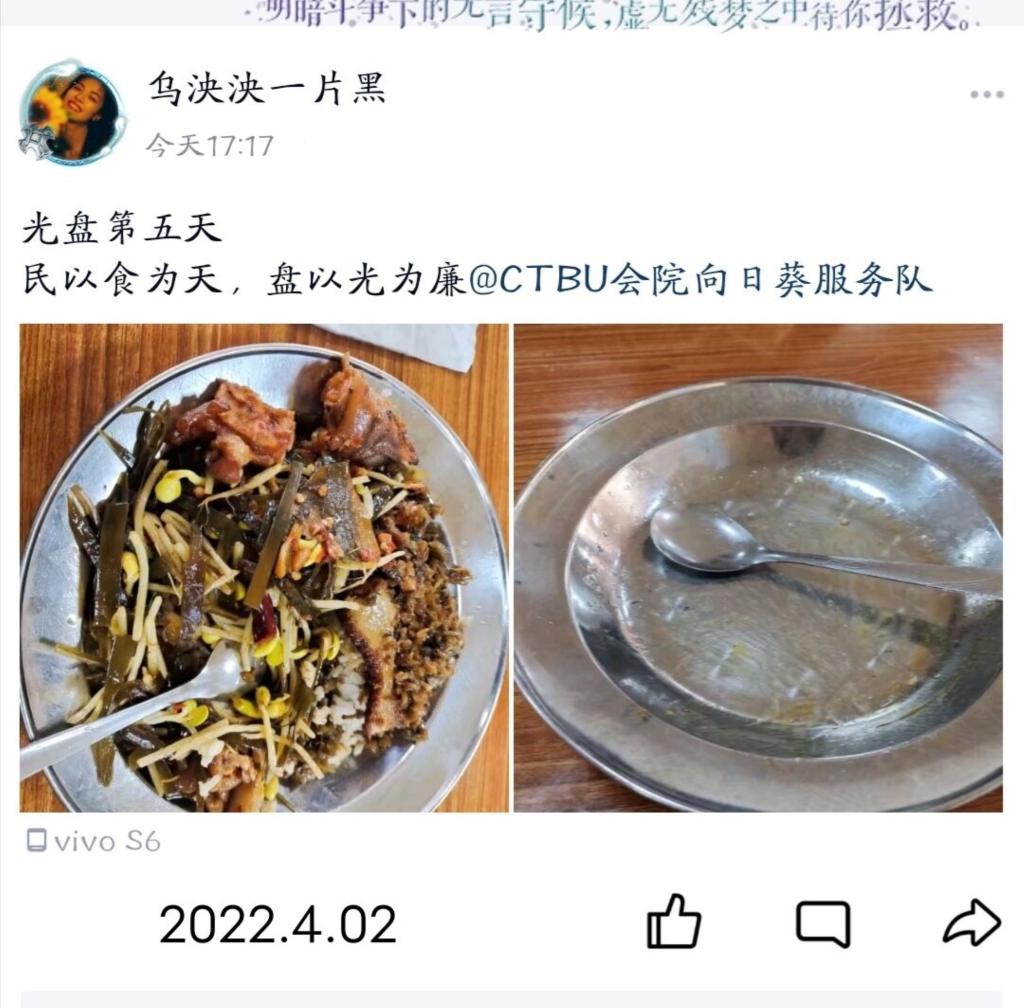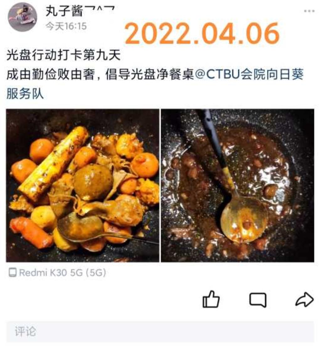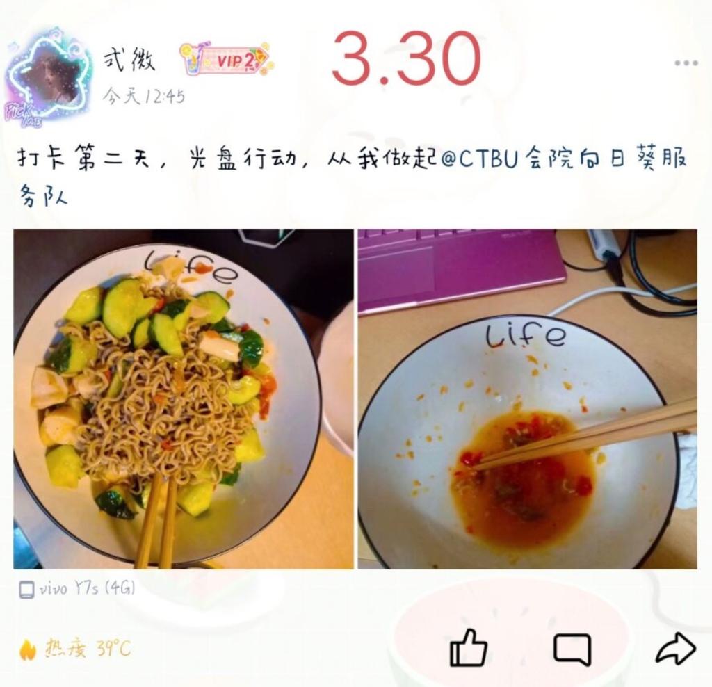 为进一步抵制餐饮浪费行为,推进形成“厉行节约、反对浪费”的社会风尚,2022年3月28日至4月6日,bb贝博艾弗森官方网站向日葵青年志愿者服务队成功举办“民以食为天,盘以光为廉”光盘线上打卡活动。