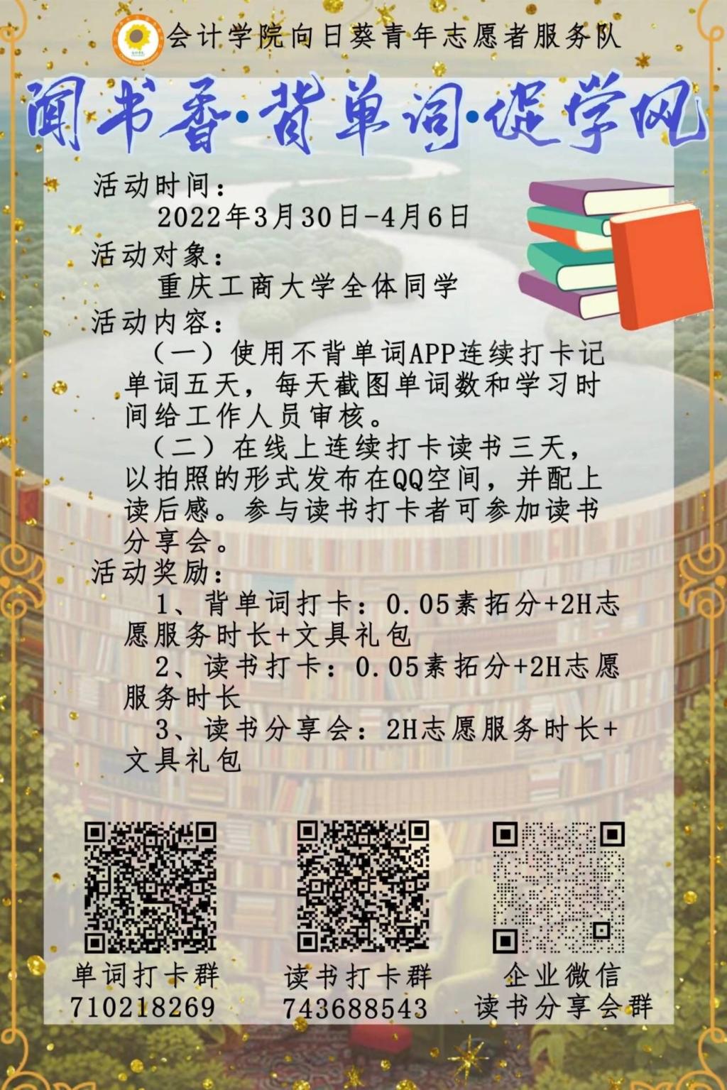 三月如歌,万物齐吟;四月新来,益学益勤。学风是治学、读书、做人的风气,是员工思想道德品质、学习精神与综合素质的重要体现,是一所大学的办学灵魂。在万物复苏,茁壮生长的春暖花开之际,bb贝博艾弗森官方网站向日葵青年志愿者服务队于2022年3月30日到2022年4月6日举办了“闻书香·背单词·促学风”学风建设活动,旨在加强公司学风建设,调动同学们的学习积极性,形成良好的学习氛围,让春花开盛,让绿树发新芽。