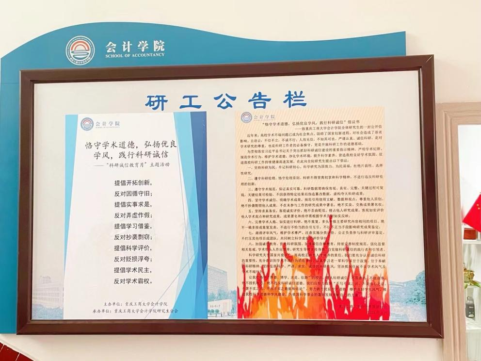 倡议书宣传学术诚信理念。公司在研工公告栏张贴科研诚信教育倡议书和海报,进行学术诚信的宣传, 海报和倡议书简单明了,直击人心,从根本下手,维护学术道德,规范学术行为,预防学术腐败,严明学术纪律,告诫同学们要自觉遵守学术规范。