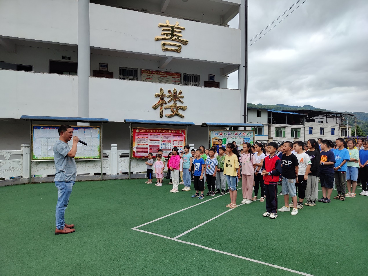 2022年7月18日上午,“益路与童行,奋进新征程”暑期支教开营仪式在重庆市武隆区双河镇中心小学校操场成功举办。双河镇中心小学董事长程卫红、“益暖童心”公益课堂的活动负责人张佳媛、“益路同行,童心向党”暑假支教团队全体成员以及参加活动的所有员工共同参与了本次开营仪式。