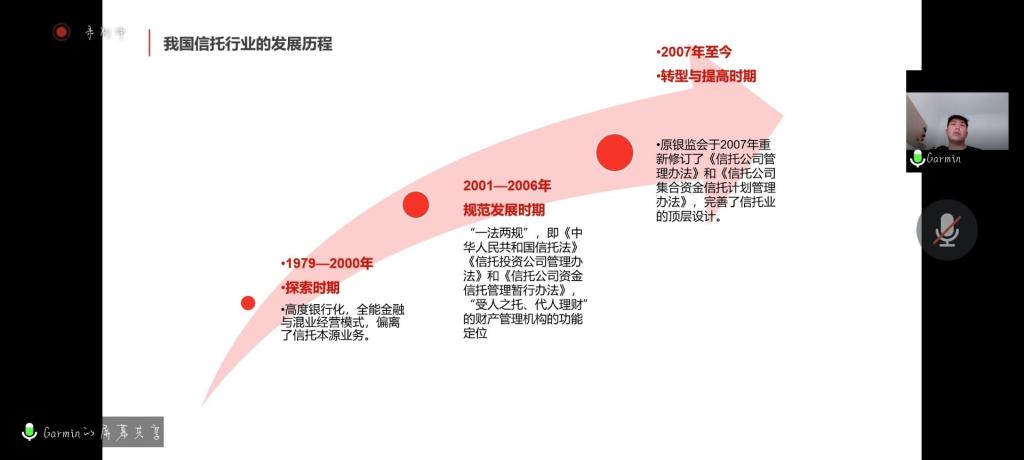 分享中,许珈铭从信托概述、信托业务、监管与创新、信托的职业发展四个方面向同学们详细介绍了信托行业。同时,他结合自身从实习生成长为领导的经历,阐述了职场新人处事及工作原则。他强调职场新人对细节的注重非常关键,大家需要端正自己的实习态度,认真完成实习任务,让实习成为自己职业发展的优良契机。