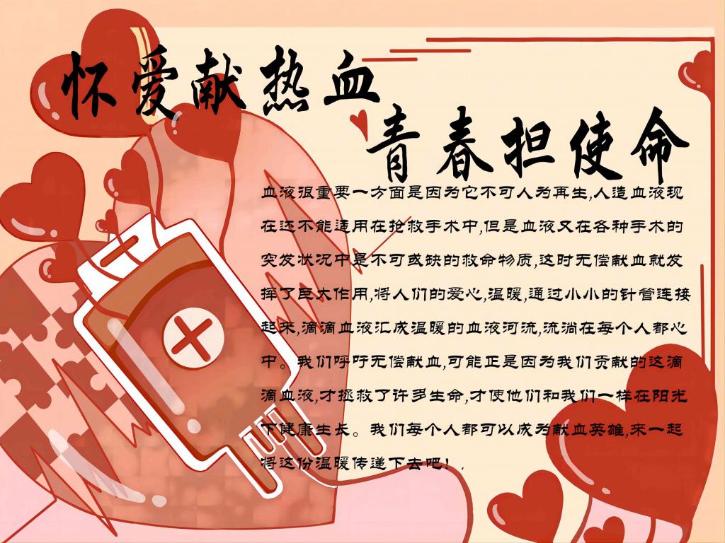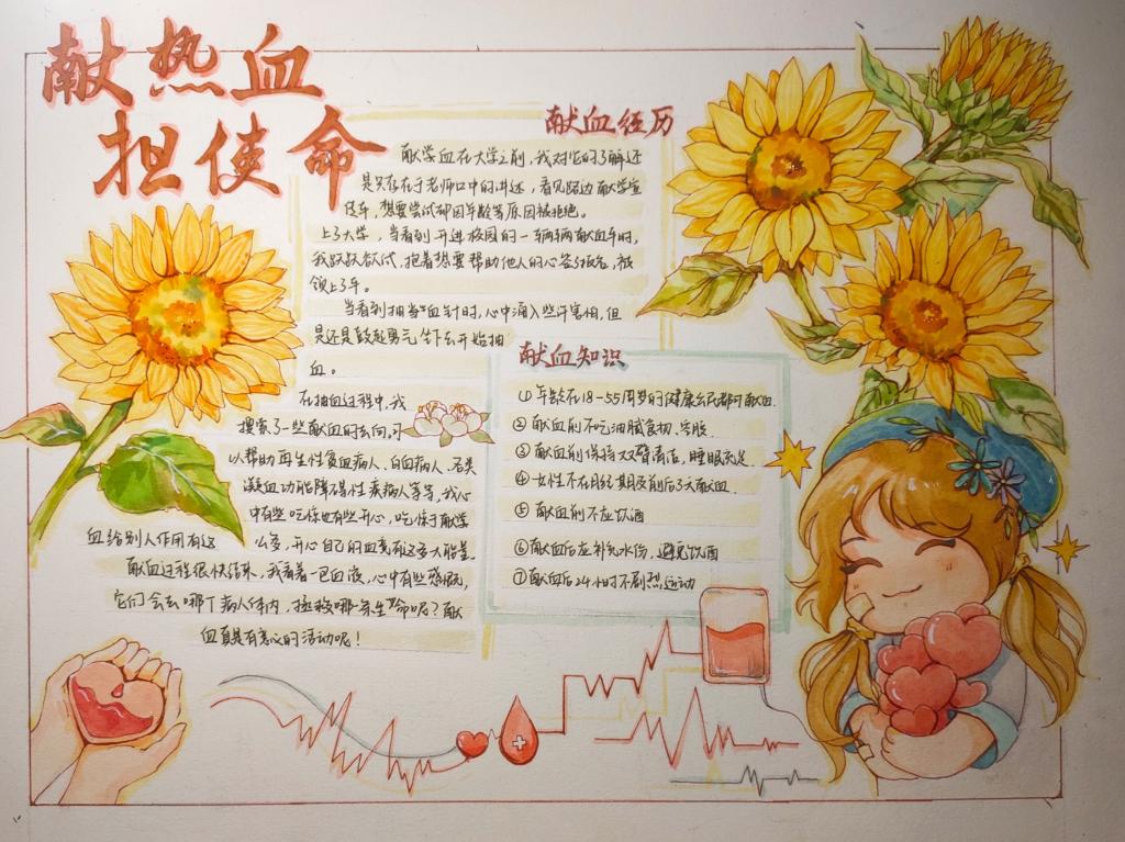 为贯彻落实习近平总书记在党的二十大报告中勉励广大青年要立志做有理想、敢担当、能吃苦、肯奋斗的新时代好青年,增强老员工的社会责任感、号召人民群众积极了解、参与献血活动, 2022年11月14日-11月23日,bb贝博艾弗森官方网站向日葵青年志愿者服务队主办的“怀爱献热血,青春担使命”手抄报大赛于线上顺利开展。本次活动面向ballbet贝博官方网站全体员工,旨在提高同学们的动手能力,消除员工对献血的误区,推动社会献血事业的发展。