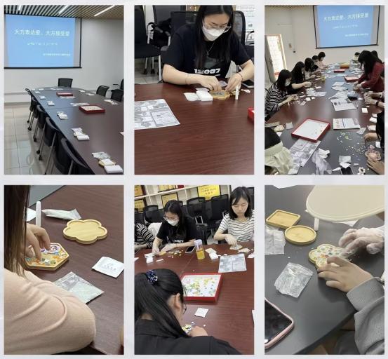 活动伊始,各位同学跃跃欲试,现场的气氛十分活跃。大家耐心阅读手工杯垫的制作说明,选择自己感兴趣的杯垫材料。在制作过程中,大家相互沟通,彼此分享灵感和想法,充分发挥想象,尝试着各种搭配,一件件创意满满的作品就此完成,使得原本普通的材料包变成了一个个承载着爱意的“专属礼物”。