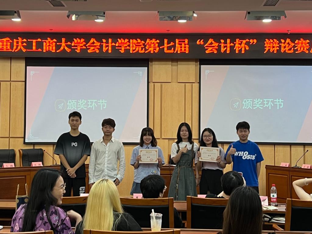 最终由本场辩论赛的执行主席宣布22财会四班为第七届“会计杯”辩论赛总冠军,评委高宇航为本届赛事的冠亚季军、孔繁静怡队长本届赛事的“最佳辩手”颁奖并合影留念。