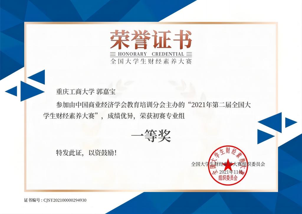 郭嘉宝 2020级审计二班,大学平均绩点4.02,中共预备党员,曾荣获国家奖学金、国家励志奖学金、综合一等奖学金、学习优秀奖学金、迪马薪火奖学金等,荣获2022年会计之星—自强之星称号。曾获得老员工“互联网+”校赛二等奖、老员工乡村振兴校赛二等奖、审计精英挑战赛校赛三等奖等。