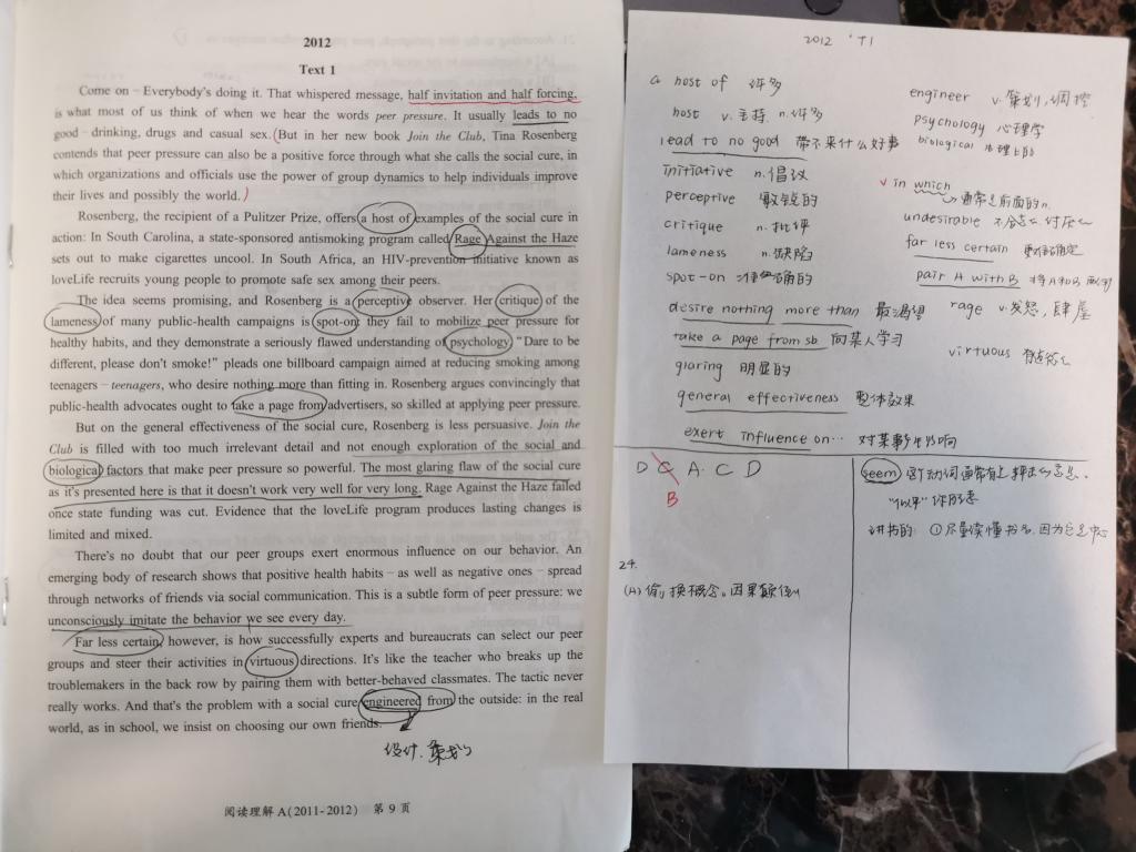 阅读:从5月起做真题的阅读。真题做三遍,第一遍精读文章,划出不认识的单词,分析长难句。不认识的单词意思不要写到卷子上,写到另外一张纸上。第二遍,做真题,每一道题的思路都要讲给自己听。第三遍,总结阅读题型。态度题?起标题题?例子作用题?