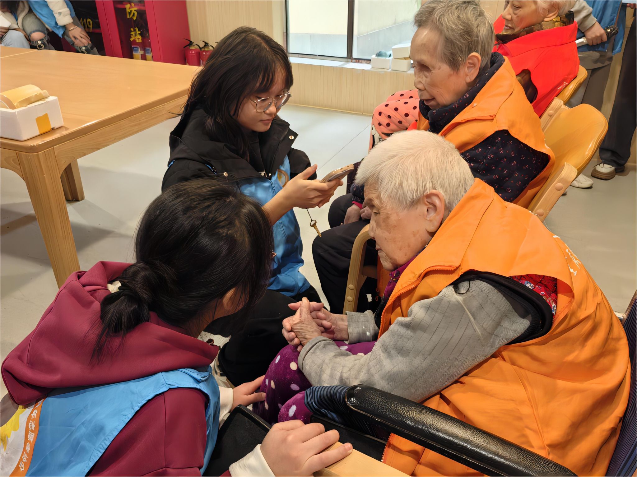 此外,志愿者们还为老人们准备了节目表演。来自不同部门的志愿者们齐心协力,带来了《千年等一回》、《女儿情》、《没有共产党就没有新中国》等老人们耳熟能详的歌曲。表演过程中,老人们沉浸其中,与志愿者们深情合唱,形成了一首首青年与老年共奏的“交响曲”。歌声回响在现场,温情回响在每一个人的心里。