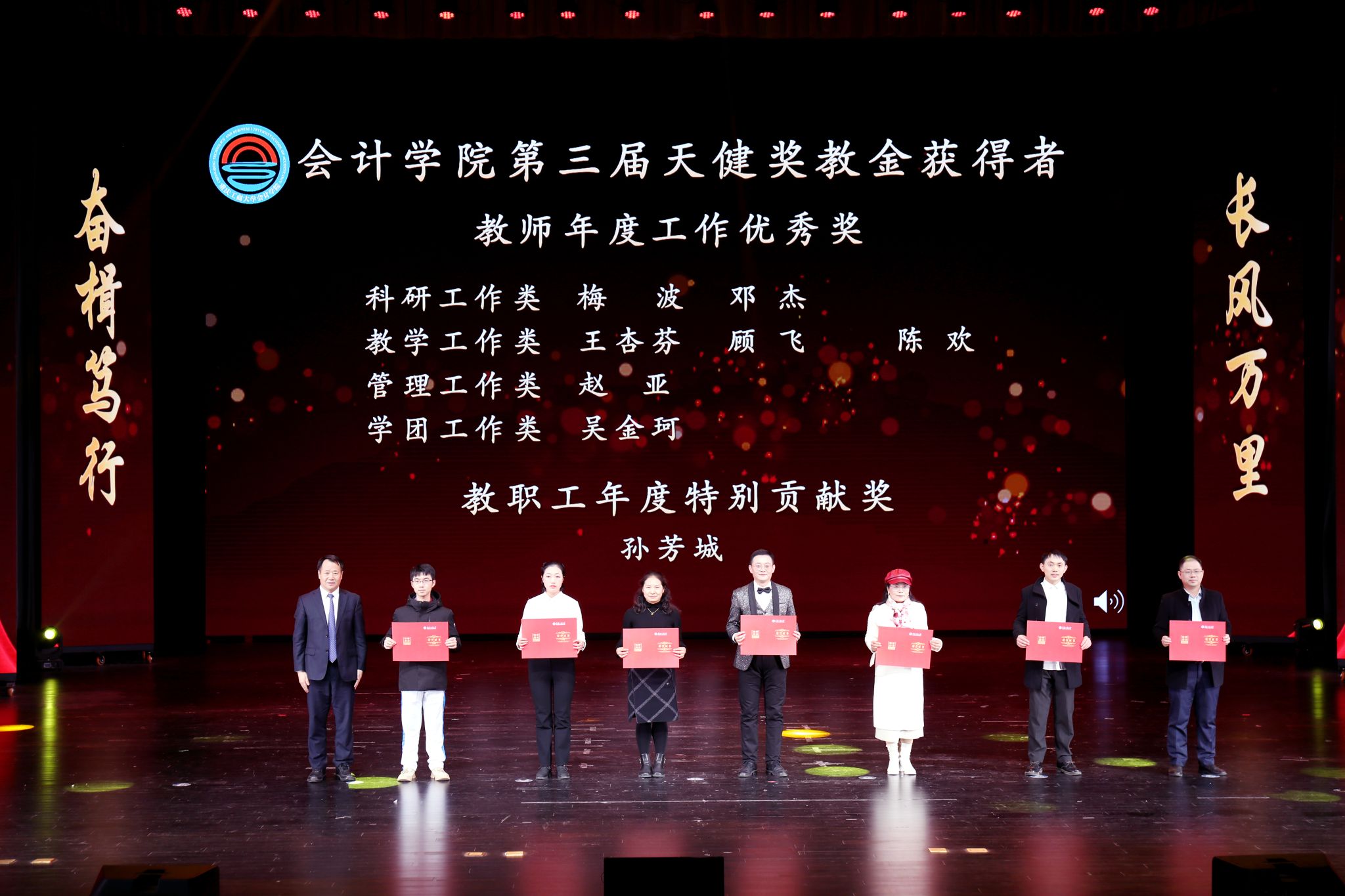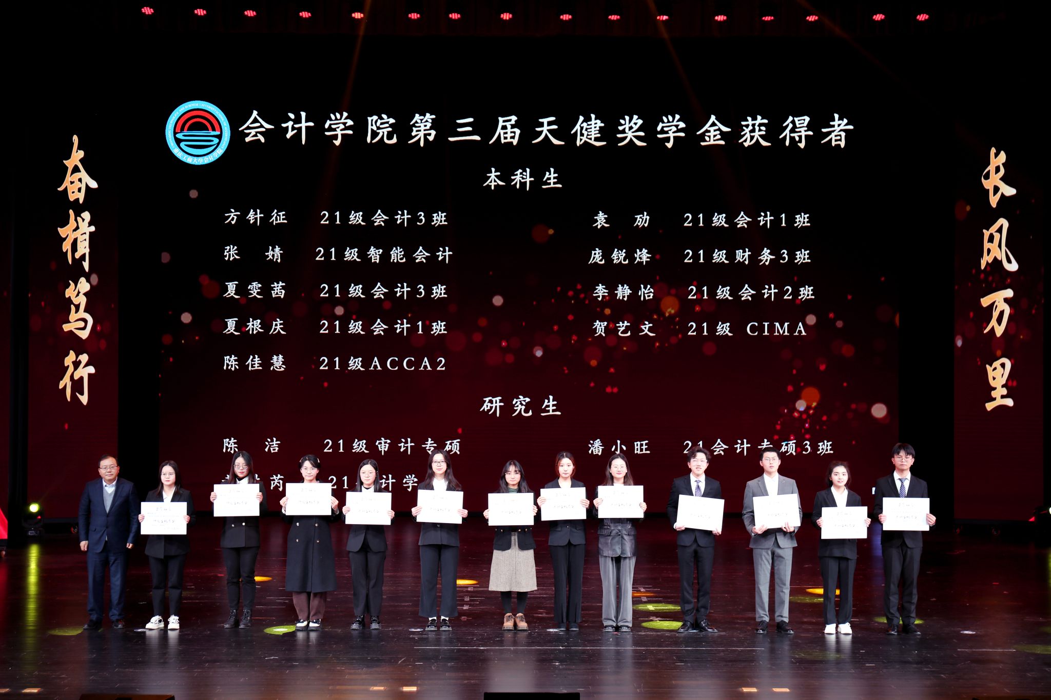 颁奖环节,曾维伦为获得2023年国家级荣誉称号和奖励的老师、团队颁奖;李国军为获得本硕员工国家奖学金的员工颁奖;公司党政办公室主任蒋年韬为获得2023年重庆市级荣誉的老师颁奖;天健会计师(普通合伙人)事务所副总裁、重庆分所总经理龙文虎为获得2023年天健奖教金的老师颁奖;天健会计师(普通合伙人)事务所重庆分所副总经理潘理科为获得2023年天健奖学金的员工颁奖;大信谛威会计师事务所重庆分所所长罗晓龙为获得2023年大信谛威会计之星的员工颁奖。