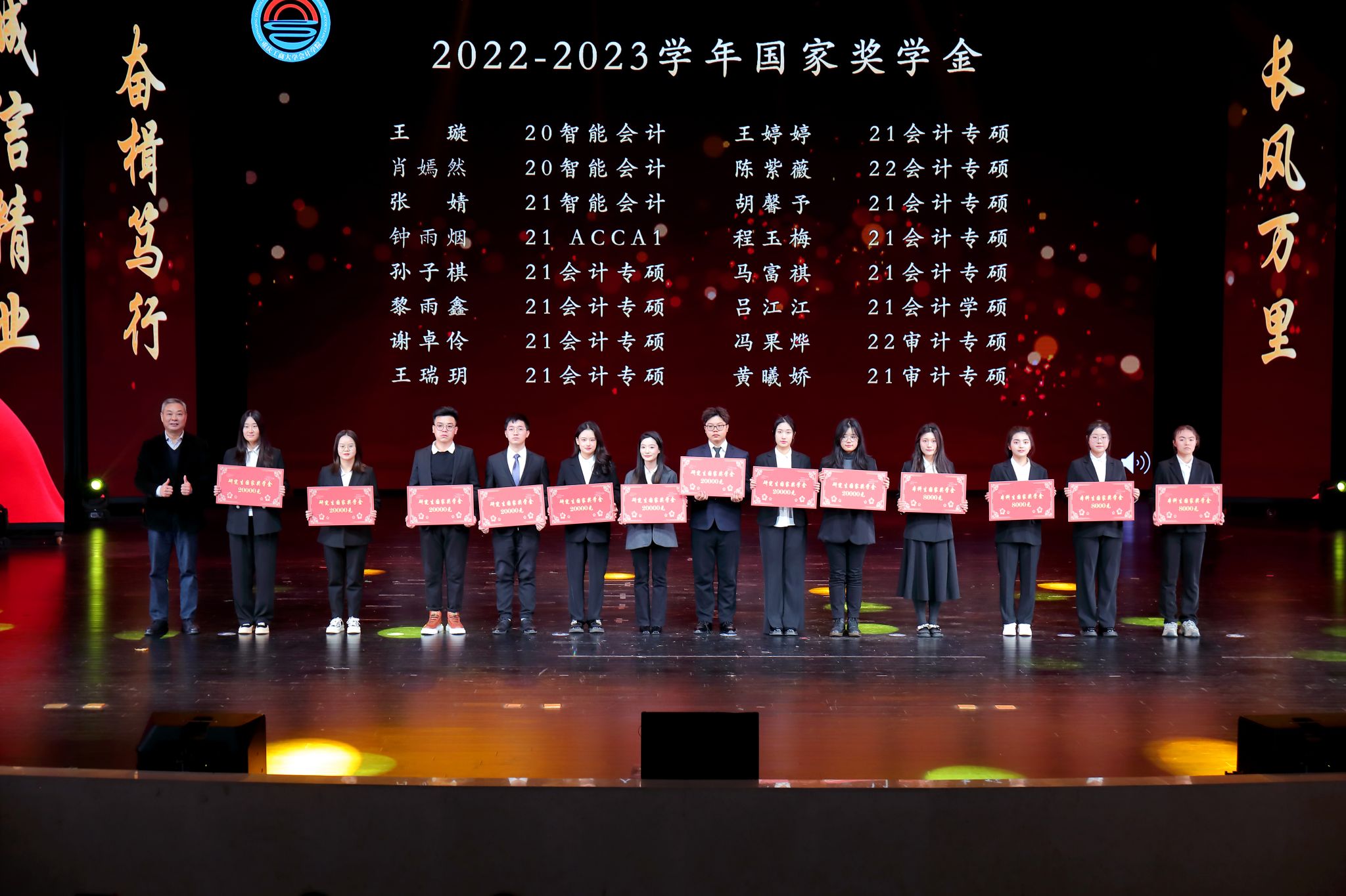 在师生展演环节中,老师和员工同台表演。学校啦啦操一等奖作品《会乐啦满》,激情四射的表演,青春活力的舞步拉开了本次典礼的帷幕。研究生代表带来歌曲串烧《如愿》《一路生花》《new boy》,彰显了新时代青年对过往的回首和对未来的美好展望。教师团队带来快板节目《携手再赴新征程 踔厉奋发永向前》,展现了会院教师昂扬向上、奋发有为的精神风貌。民乐合奏《灯火里的中国》,温暖的旋律让人感受到灯火下的安定与幸福。会院向日葵志愿者服务协会员工代表带来舞台剧《我想加入向日葵》。展现了志愿者们“志愿于心,服务于行”的真切热情和责任担当。教师团队带来了走秀节目《霓裳魅影·师生情》,展现了会计老师的自信与风采。在《一起向未来》的歌声中,全体演职人员与领导嘉宾走上舞台合影留念。