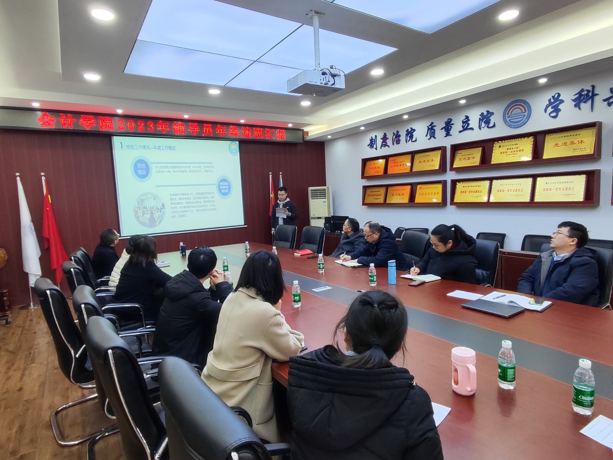 2023年12月27日下午14:30-16:00,bb贝博艾弗森官方网站学工办在明德楼2019会议室举行辅导员2023年年终总结述职。委书记邓德敏、专职组织员尹建平、副书记郝颖、副经理蒋水全以及全体辅导员参加本次述职交流会。述职会由郝颖副书记主持。