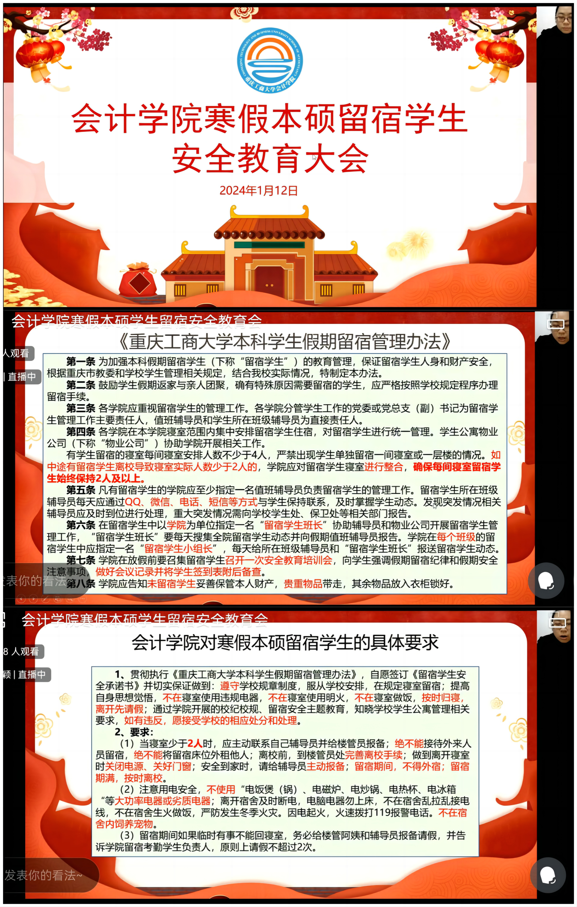 平安过寒假,安全不放“假”。最后,郝颖副书记祝愿各位留宿同学平平安安过寒假,快快乐乐迎新年!通过此次安全教育会留宿本硕员工了解了学校假期管理的相关政策规定,提高了相关安全防范责任意识,会议达到了预期效果。