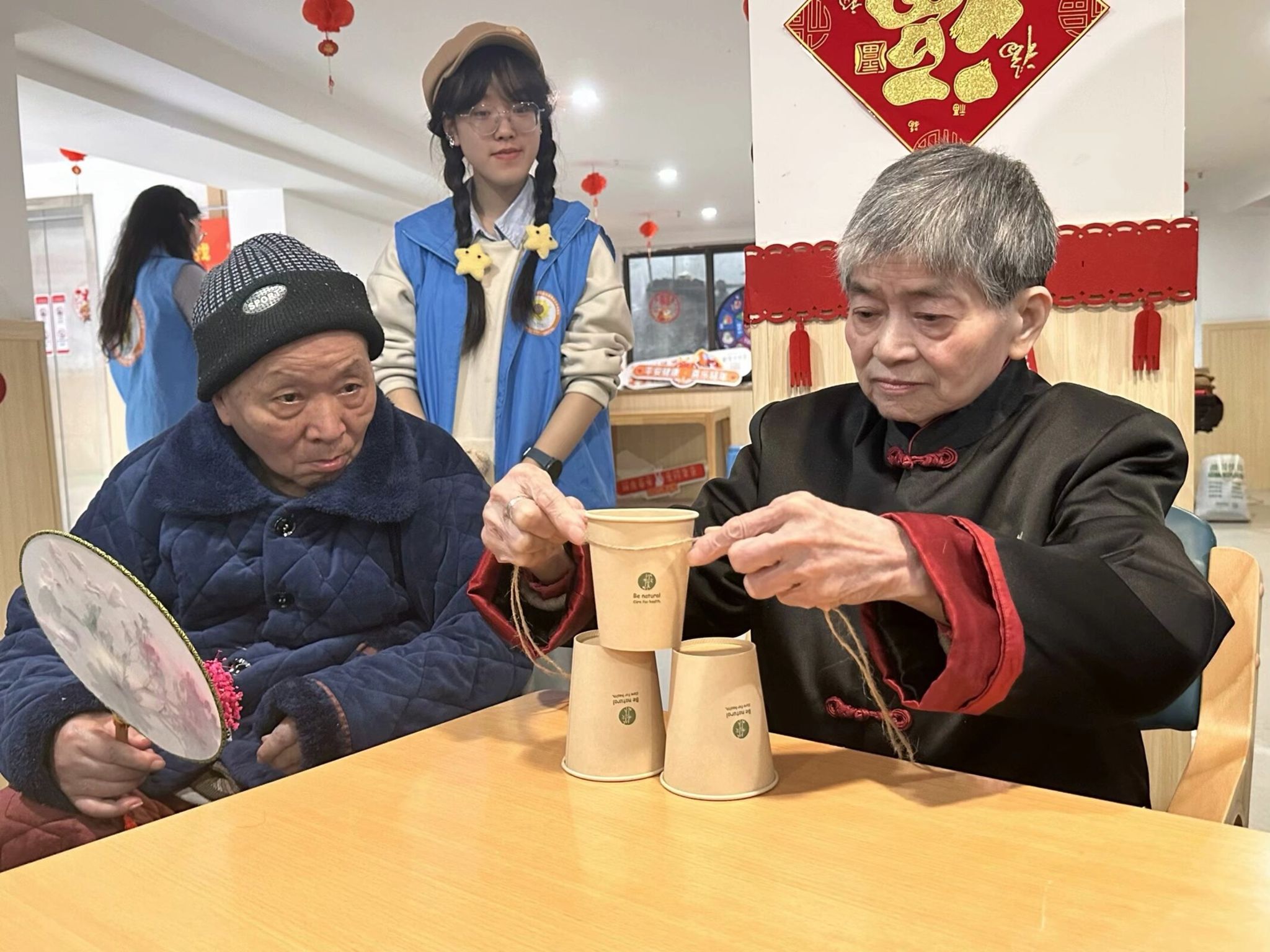 随后开启了趣味游戏环节:“筷子取杯”和“纸杯叠罗汉”,让现场的气氛更加活跃。游戏过程中,老人们展现出活力的一面,认真完成每一个步骤,不时发出阵阵欢呼。休息片刻后活动厅中又传来了欢快的歌声:“学习雷锋好榜样,忠于革命忠于党……”,是志愿者们在唱歌。在欢快悠扬的歌声中,老人们兴致高昂,与志愿者们合唱,在歌声中感受年轻人的朝气,仿佛让他们回到了青年时代。