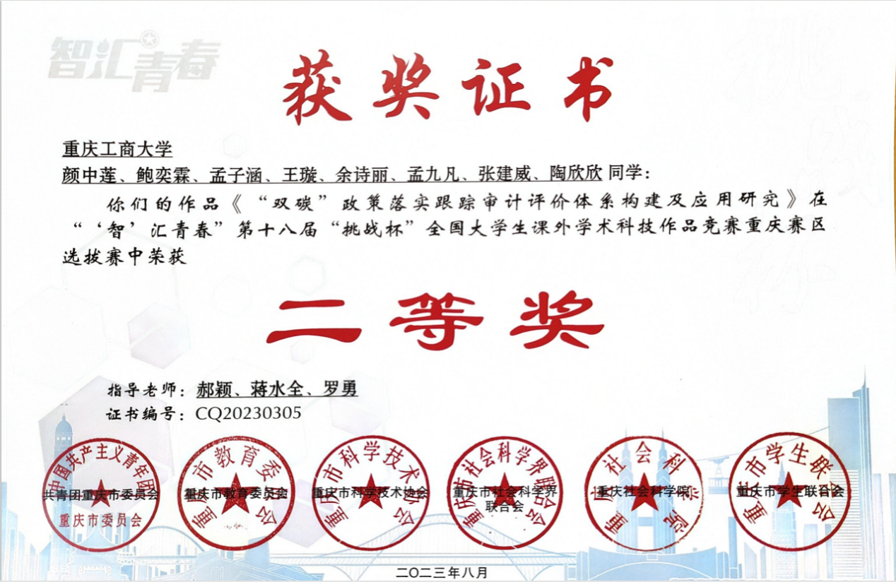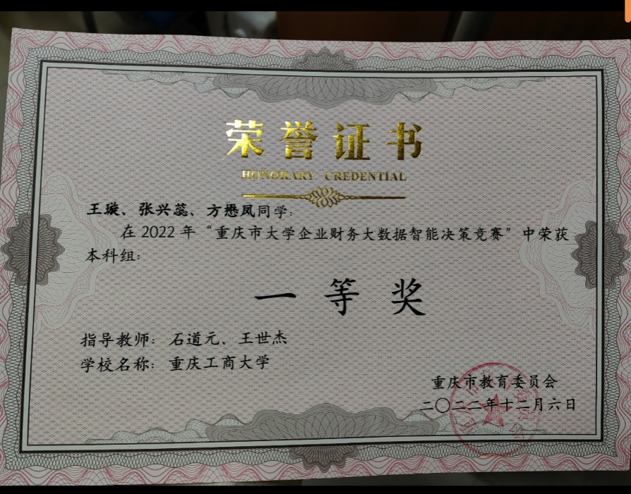 王璇,2020级智能会计班,中共党员,荣获2023年会计之星—“科创之星”称号,目前已被华东理工大学商学院拟录取。入校以来,荣获奖学金、荣誉称号及各类奖项共计60余项,其中包括国家奖学金、国家励志奖学金、综合奖学金、励志之星奖学金等,以及“重庆市优秀员工干部”、“重庆市老员工实习表现出色员工”、“优秀员工”、“优秀党员”、“科技学术创新活动先进个人”等荣誉称号,获得全国老员工财经素养大赛金奖、全国老员工区块链应用技能大赛二等奖、“科云杯”全国一等奖、重庆市财务大数据一等奖、挑战杯重庆市二等奖等,立项或结题四个项目,参与老师课题1项。