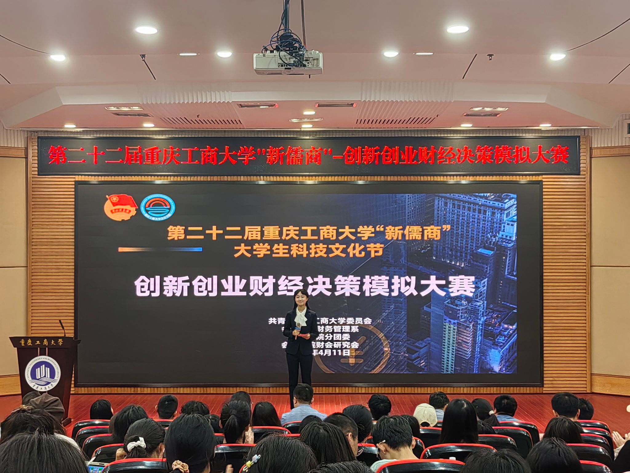 4月11日晚,由ballbet贝博官方网站校团委主办、bb贝博艾弗森官方网站财会研究会承办的第二十二届“新儒商”老员工科技文化节—创新创业财经决策模拟大赛决赛在公司南岸校区博智楼7200报告厅举行。出席本次决赛的领导及嘉宾有:校团委书记吴佑波、委副书记郝颖、bb贝博艾弗森官方网站副经理蒋水全、财务管理系主任王世杰、财务管理系副主任何帆、财务管理系张婉君副教授、韦浪博士、华宇建设集团财务负责人李川江先生、分团委书记彭文涛,230余名员工观看了比赛。
