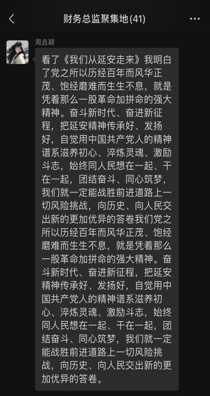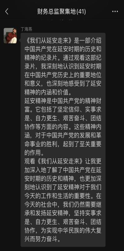 观影结束后,同学们纷纷在班级微信群发表观影观后感,分享对延安精神的理解和感悟,以及对纪录片《我们,从延安走来》的感想,革命志士为了中国的解放中国人民的独立自由做出了巨大牺牲,像白公馆渣滓洞的革命先烈倒在了黎明到来前的敌人的枪口之下,我们无不深深痛惜他们的生命也感叹到现在美好和和平的生活来之不易。