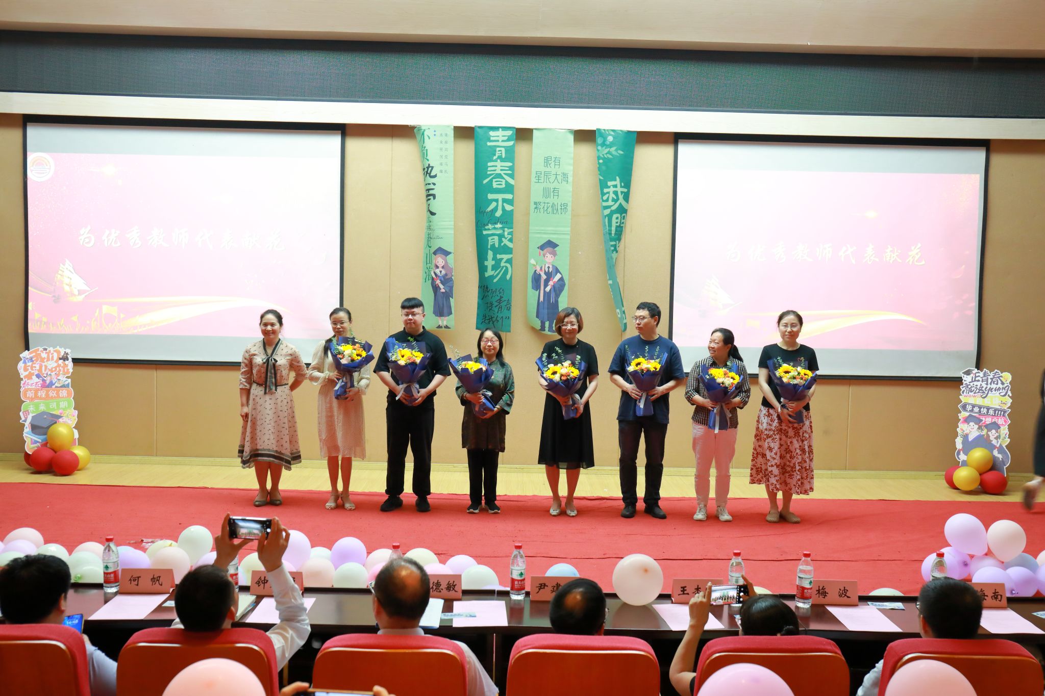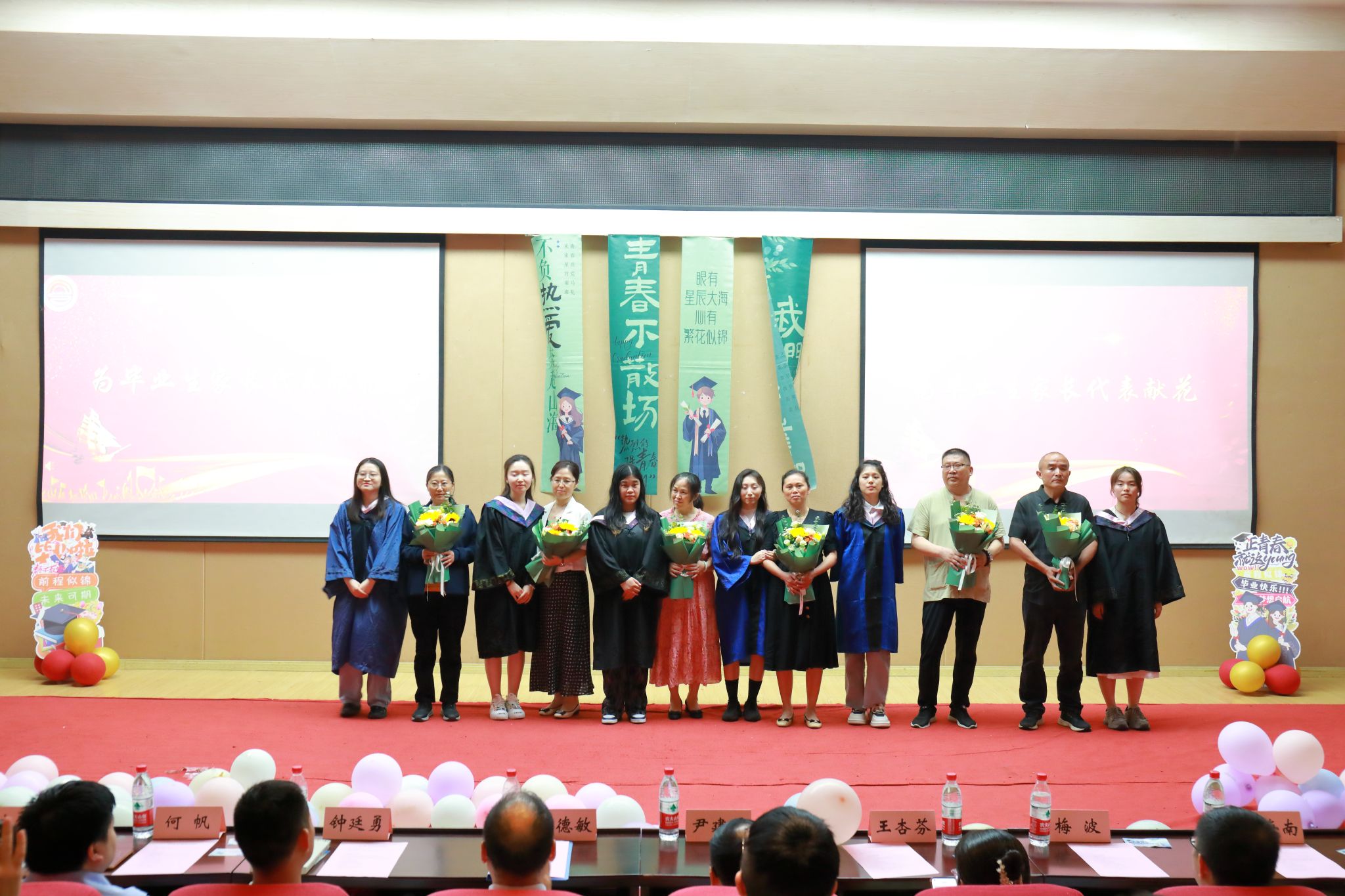 公司2024届毕业生代表们为教师代表、家长代表献上感恩的鲜花。