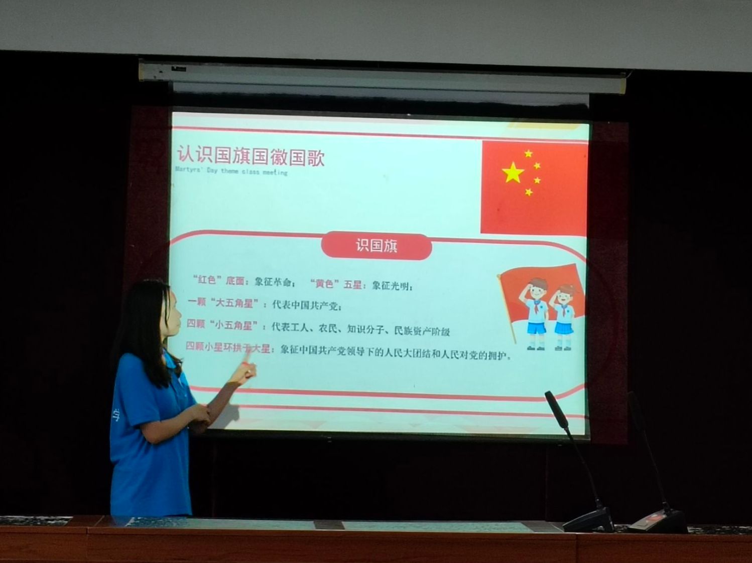 德育的第一节课为认识课,志愿者首先给小朋友们观看那年那兔那些事,吸引小朋友们的注意力,以动漫最后一幕为切入点,让小朋友们认识新中国成立时毛主席讲话的场景,体会国旗升起的激动,从而来讲解国旗的相关知识。志愿者用通俗易懂、生动形象的语言讲解国旗和国徽的深层含义。在讲解过程中,志愿者采用疑问句的形式询问小朋友们国歌和国花,让小朋友们积极举手参与课堂,同时课堂中采用举手回答问题来收集小红花兑换奖励,这更加激发小朋友们的课堂参与度。