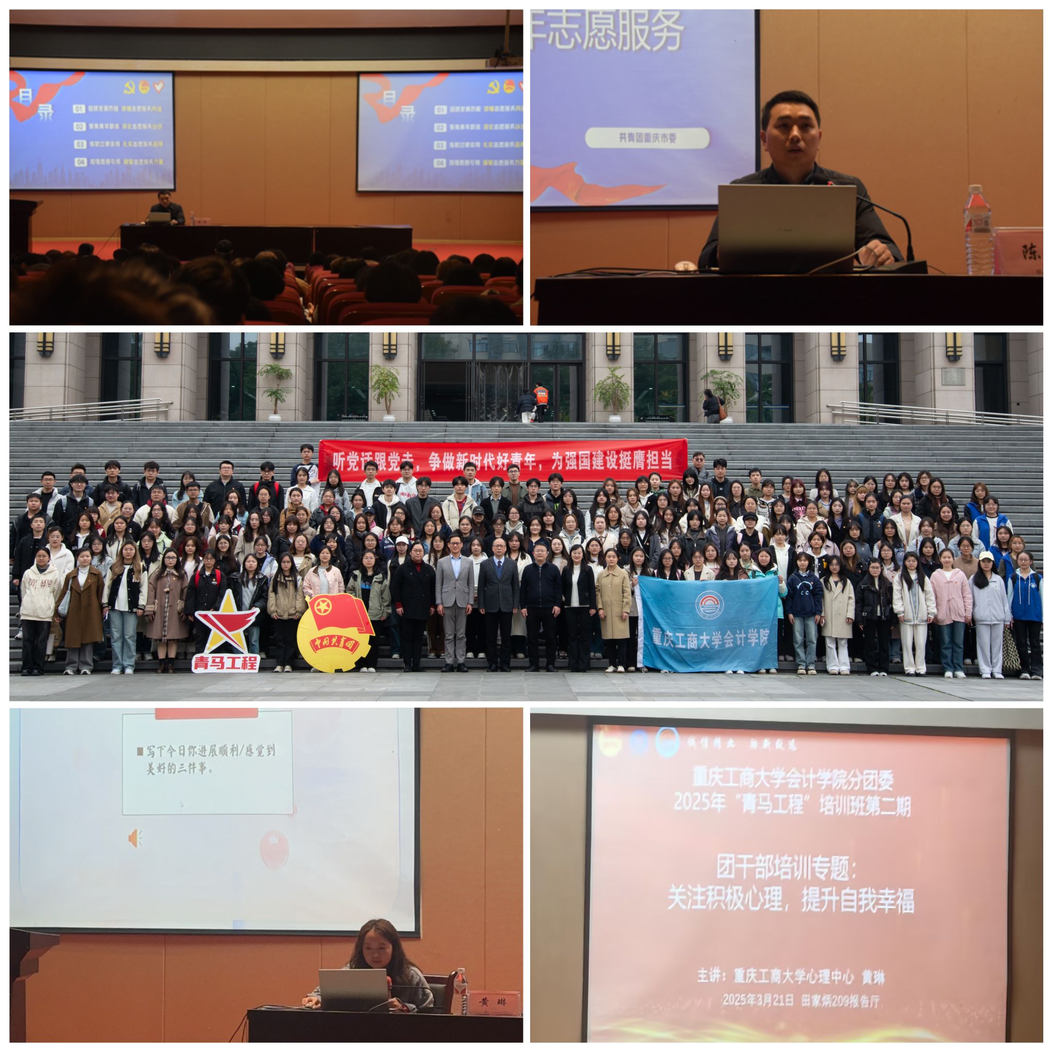 第二期培训是由学校心理咨询中心专职心理教师、国家二级心理咨询师黄琳老师带来的团干专题培训“关注积极心理,提升自我幸福”。首先围绕“幸福是什么”进来了一场互动交流,同学们迅速进入状态,跟随老师的思路,展开了一场觉察自我、探索幸福的心灵之旅。关于“人为什么不容易幸福”,黄琳分享了阻碍人们感知幸福的六种心理惯性,并一一进行了分析、拆解,还用具体事例做了生动说明。例如,关于“对比”,人们习惯于与其他个体对比,如果转向与自己的“过去”对比,则更容易收获幸福。关于“幸福的真相”,黄琳从字源学角度做了阐释,并分享了获得幸福的方法。例如,如何通过共情获得幸福,如何通过正确的沟通获得幸福,等等。最后,写下并分享“今天让你觉得幸福的三件小事”,同学们真情投入,现场温馨感人。在老师的解释下,也让大家懂得“让人们觉得幸福的、记忆深刻的,往往是‘经历’,而不是具体的‘物质’”。本期培训专业、深刻、温暖、实用,对于提升同学们心理素质、增强生活幸福感别具意义。