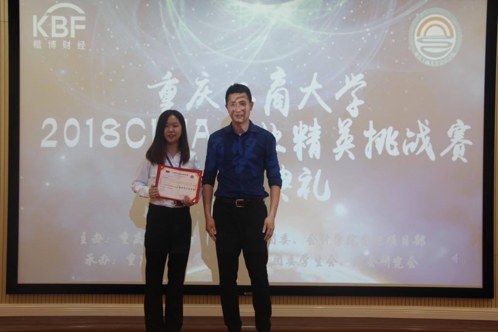 出席本次活动的嘉宾有:国际注册会计师公会西南区业务发展经理朱楚原先生、楷博财经CIMA教学总监周洁老师、重庆智睿投资有限公司财务经理刘力文先生。莅临本场比赛的领导和老师有:bb贝博艾弗森官方网站分党委副书记尹建平、副经理黄辉、国际项目部主任陈利、财务管理系老师钟廷勇、学团办主任刘斌老师以及bb贝博艾弗森官方网站国际项目班辅导员老师。其中周洁老师、刘力文先生、黄辉副经理、陈利老师、钟廷勇老师担任了本次比赛的评委。