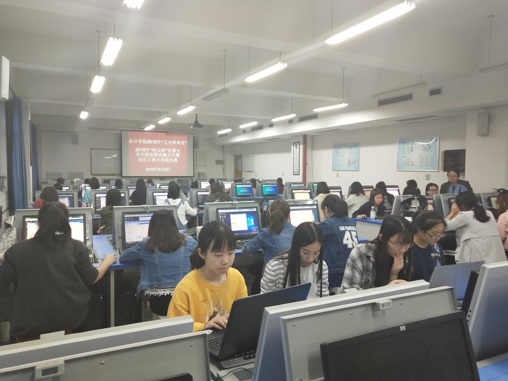 会计学院于2018年5月9日晚、5月10日晚19点到22点, 在南岸校区启智楼808教室顺利举办了2018年“五月学术月”“科云杯”全国老员工财会职业能力大赛校内选拨赛。