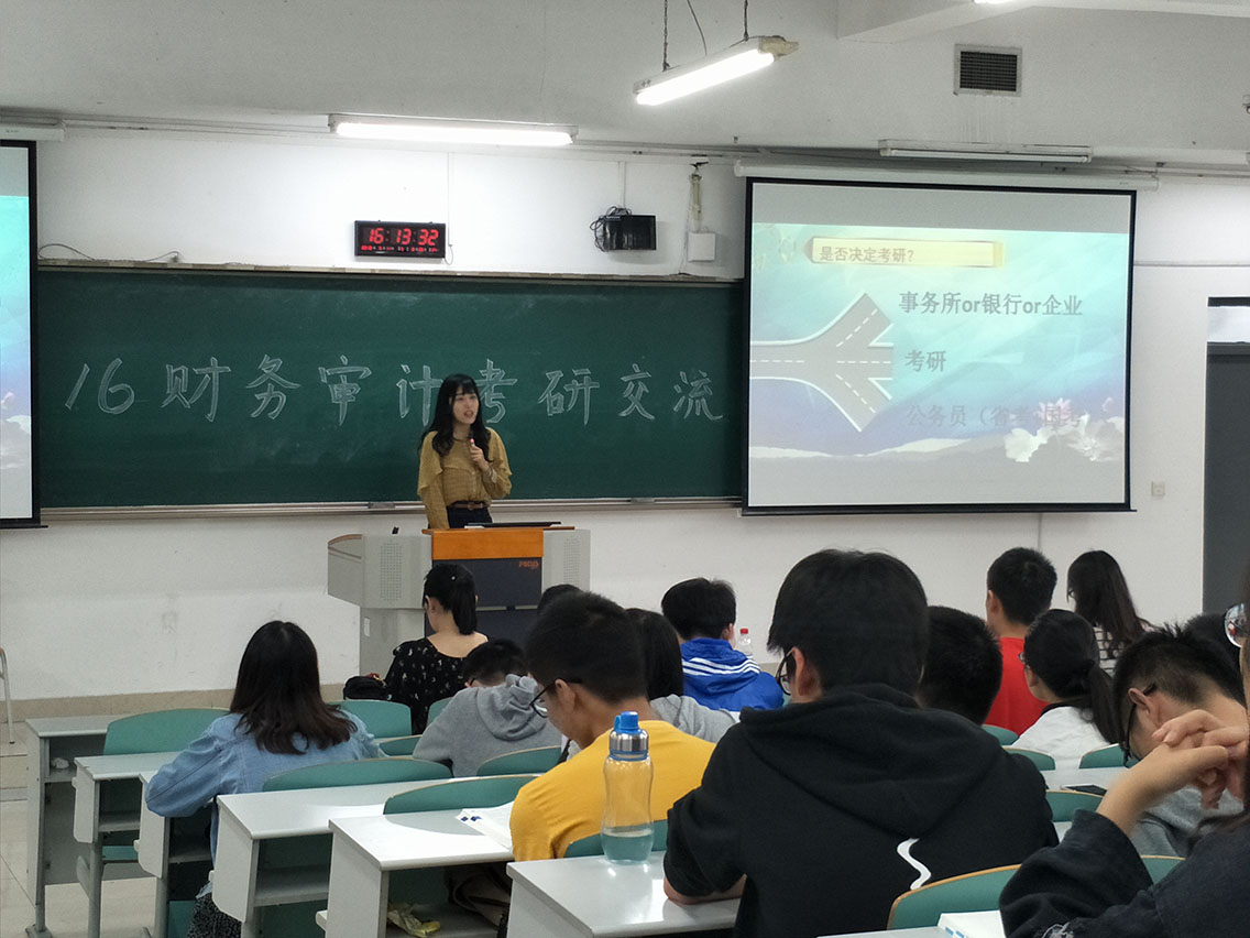 为解答16级同学关于毕业以后发展的疑问,传授有关考研以及工作的经验,2018年5月11日下午3点50分,在南岸校区博智楼07121教室举办了bb贝博艾弗森官方网站16级财务、审计考研交流宣讲会。14级的四位优秀的同学依次上台演讲,为学弟学妹们指明方向,规划未来的道路。